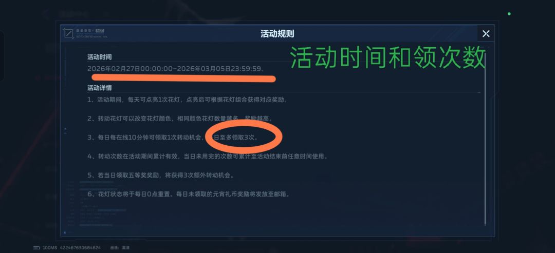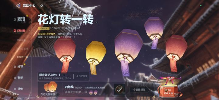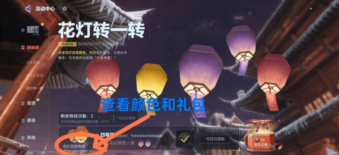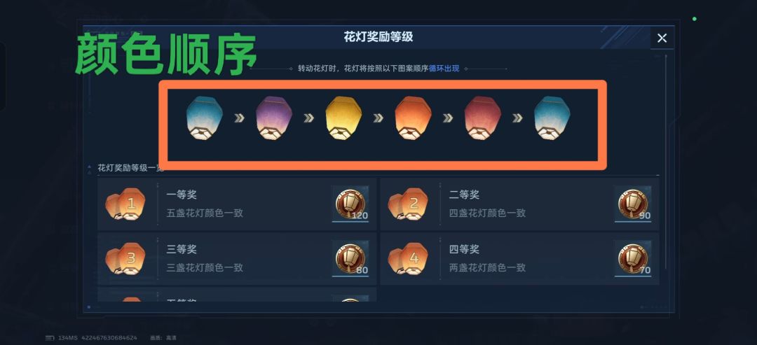 活动玩法介绍:玩家在活动中消耗转动次数,五盏花灯会随机切换颜色。