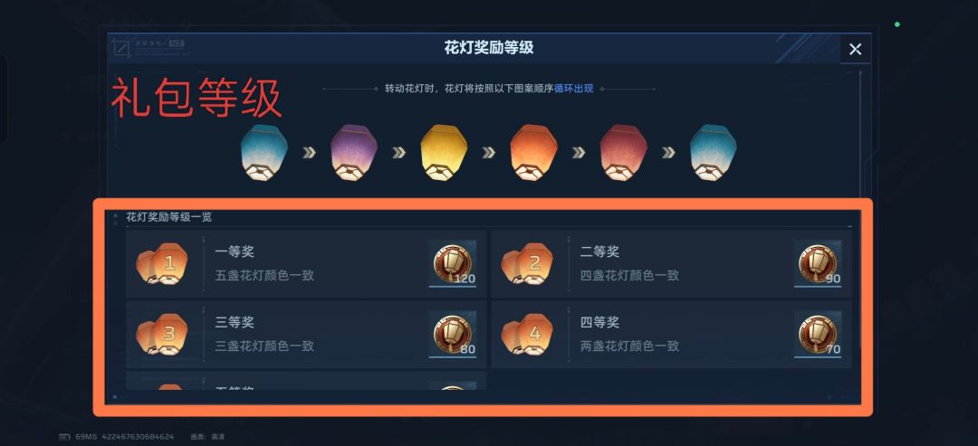奖励分为四个档位:五盏花灯颜色一致为一等奖
