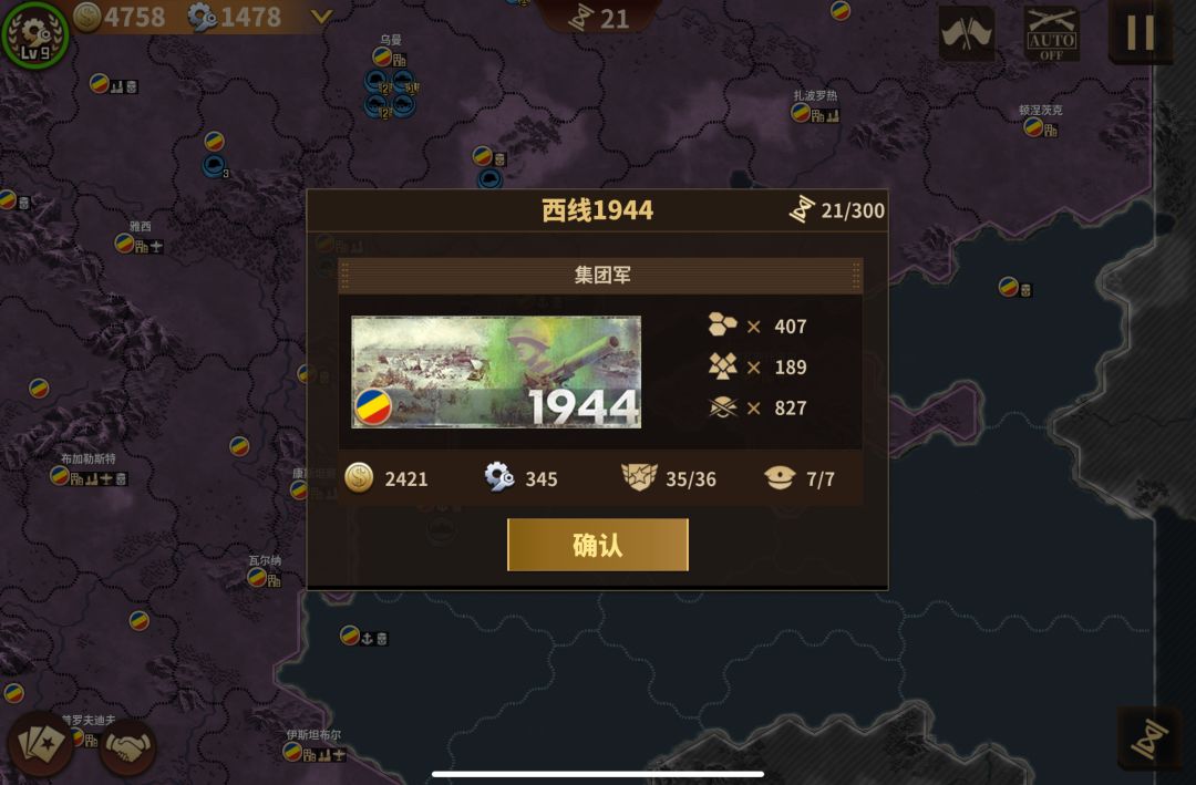 集团军都是初通,全场齐宣,没有刻意刷分,只有打1944是接近满科技。失误也不少,比如昨天算好收掉德C却没成功,满世界找了半天才发现十万八千里外的南极还有一个船在浪,导致直接缺失了两个特种兵。比如有时最后一回合电脑会把你算好占城的部队禁足,导致要白白多等一回合。
