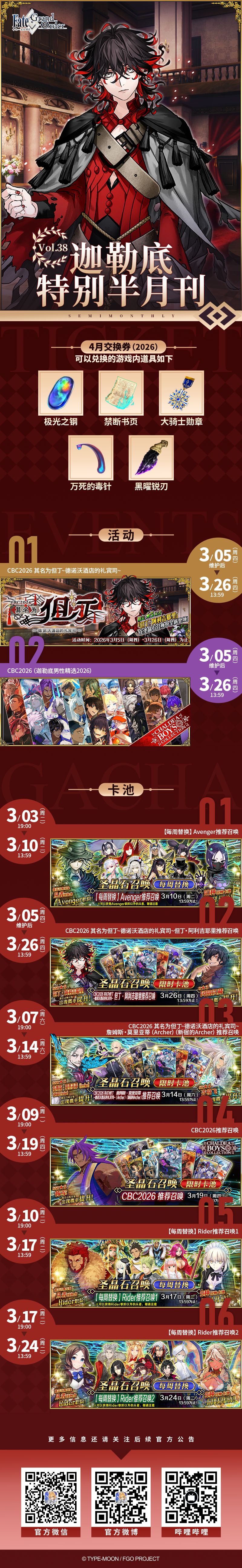 感谢各位御主对《命运-冠位指定》一直以来的关注和支持,为方便御主确认后续活动安排,《迦勒底特别半月刊》Vol.38已发布,详见下图。