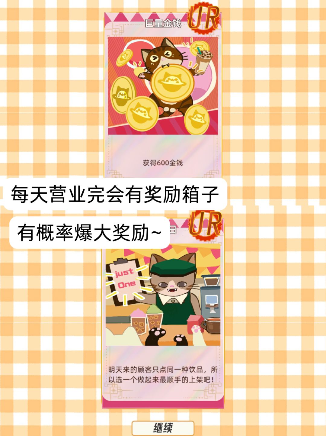 ✔️每天营业完后,会有奖励箱子,会开出不同奖励哦,有时候是金币,有时候会开到一些偷懒机制,比如单品日【明天的顾客只点同一种饮品,选一个做起来最顺手的上架吧!】