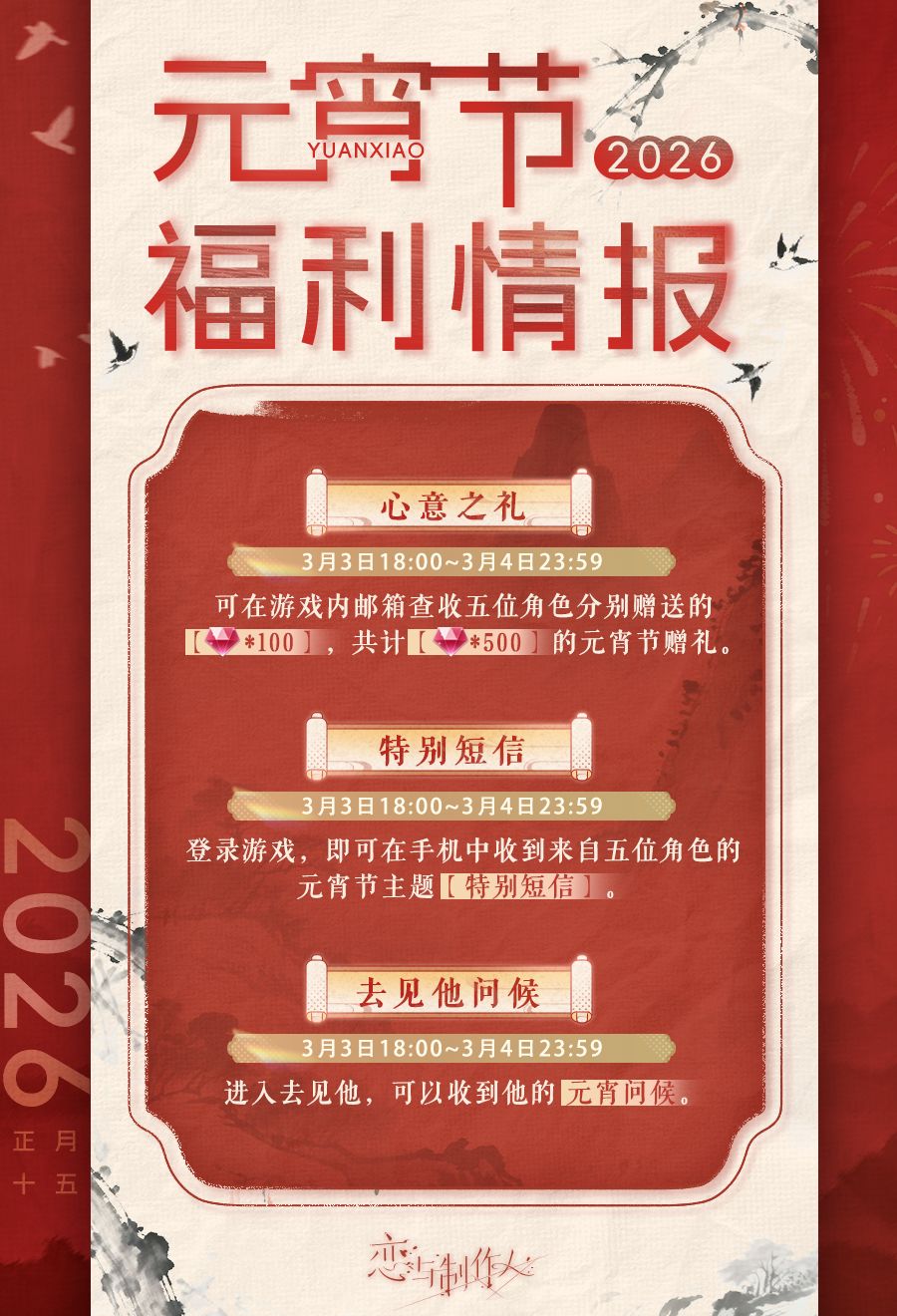 可在游戏内邮箱查收五位角色分别赠送的【钻石*100】,共计【钻石*500】的元宵节赠礼。