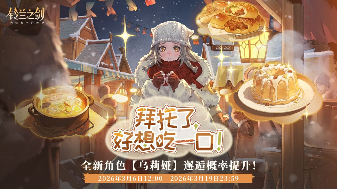 「拜托了,好想吃一口!」初遇限时邂逅将于 2026/03/06 12:00 - 2026/03/19 23:59 开启,全新传说角色「乌莉娅」邂逅获取概率将大幅提升!