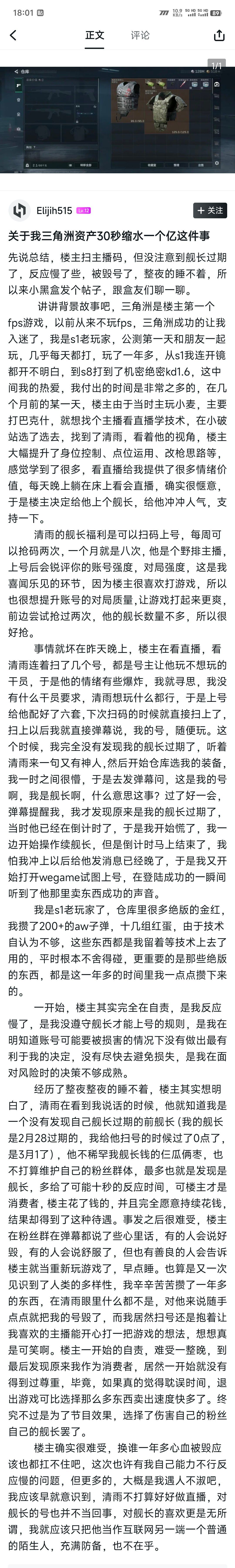 该玩家是从S1赛季坚持至今的资深玩家,长期支持一名教学类野排主播并多次开通舰长。2月28日深夜,他因未察觉舰长已到期,仍扫码授权主播登录账号进行直播展示。主播发现未续费后,未做任何沟通,直接在直播中变卖、丢弃玩家仓库物资,短短 30 秒将其一年多积攒的家产清空。