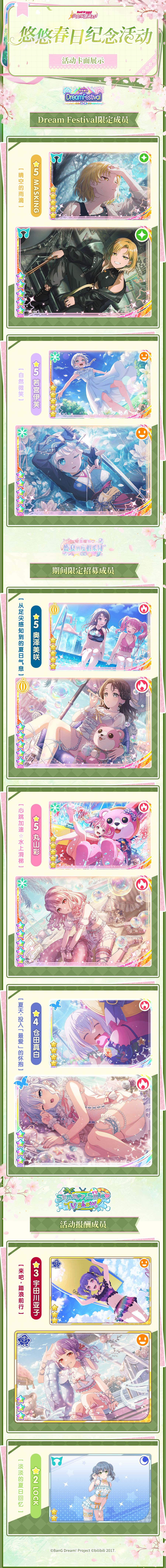为了庆祝悠悠春日庆典活动的到来,现在为您带来即将在「悠悠春日Dream Festival招募」出现的全新Dream Festival限定成员卡面和新登场期间限定成员卡面,以及「Summer Smile♡TV show!」活动报酬卡面的展示一览!
