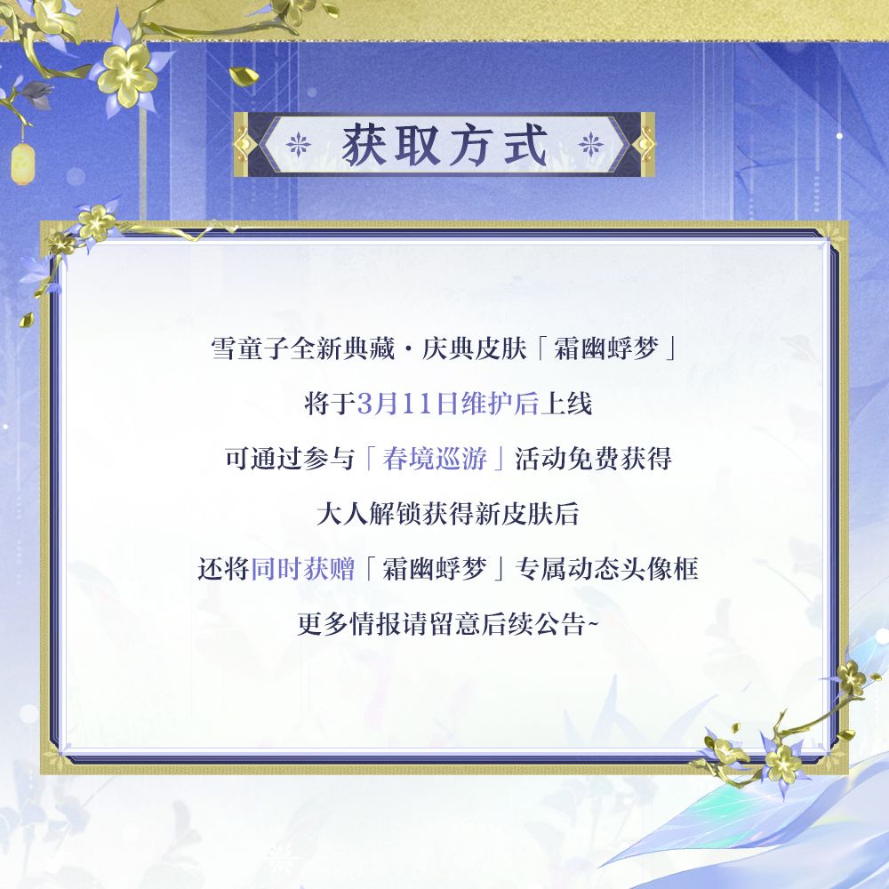 雪童子全新典藏·庆典皮肤「霜幽蜉梦」将于3月11日维护后上线,可通过参与「春境巡游」活动免费获得!大人解锁获得新皮肤后,还将同时获赠「霜幽蜉梦」专属动态头像框。