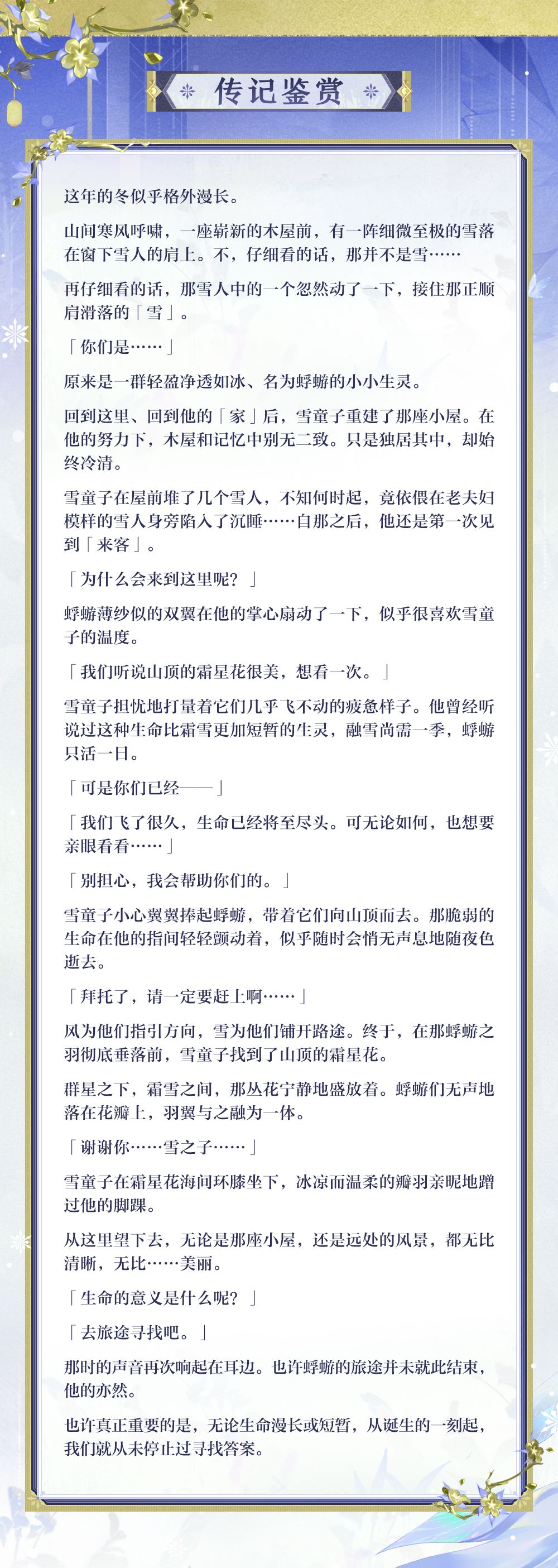 蝣栖落霜星花,薄羽轻覆相融。雪童子立于花海之畔,见证这场静默的羽落——或许生命的意义,并不在于这趟旅途的长短......