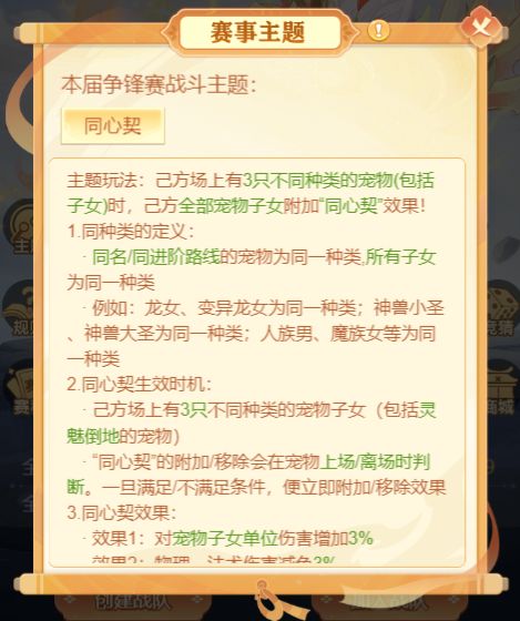 己方场上有3只不同种类的宠物(包括子女)时,己方全部宠物子女附加“同心契”效果!