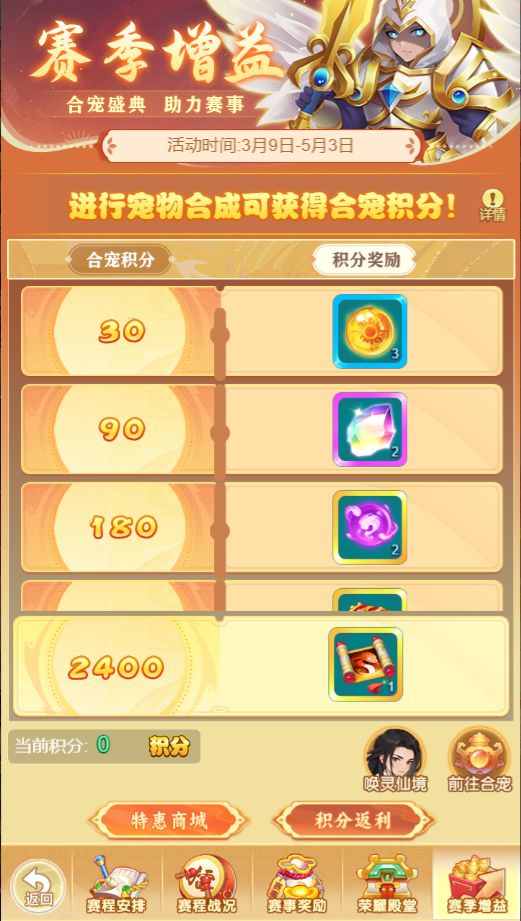 1.s10赛季期间进行合宠操作(满足特定条件)可获得合宠积分,累计获得积分达到一定值可领取丰厚奖励!