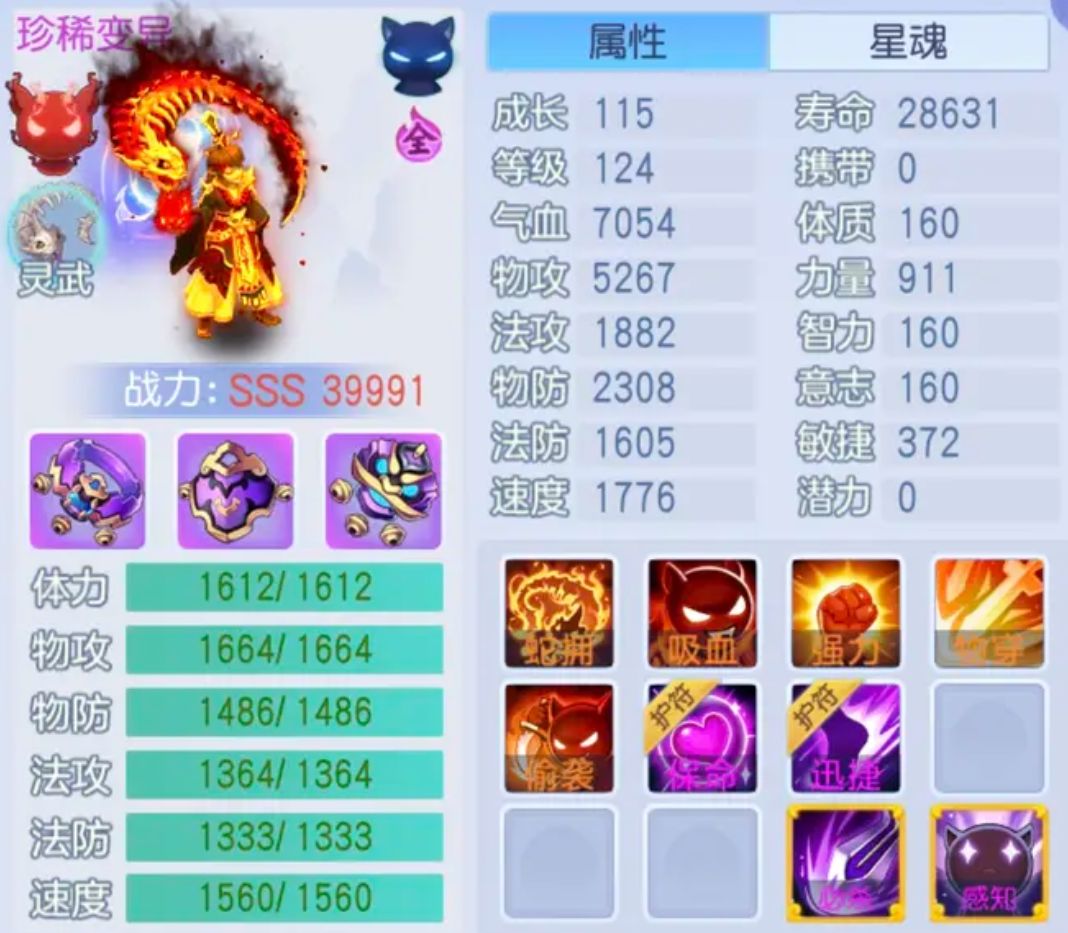 成长115全满,体力、物攻、速度资质全满,资质非常优秀。