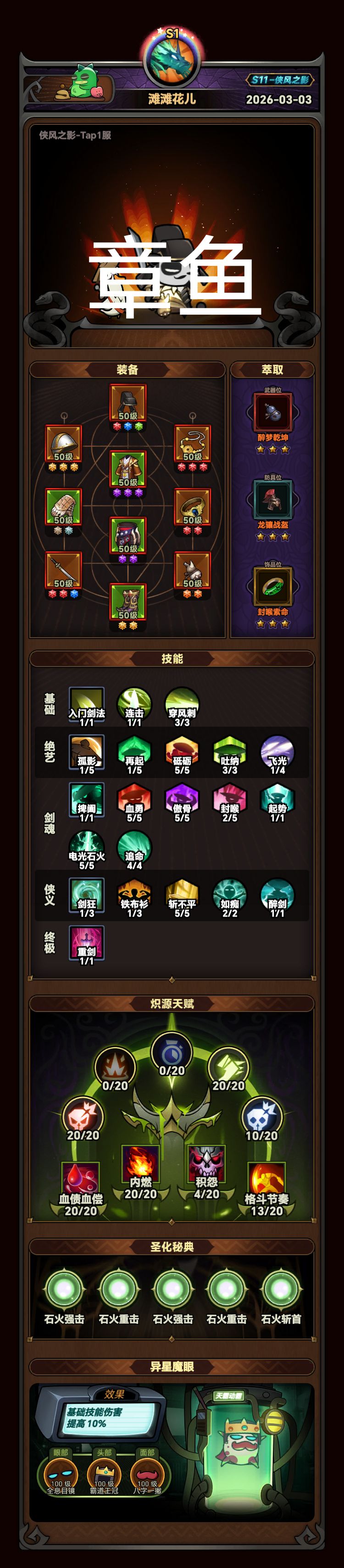 换来换去终于过了,主要是小怪图不能用破阵曲和200个怪的手镯,章鱼图前面三个塔尽量占快一些,积怨正好有层数。过章鱼的搭配忘了存,重新配的可能有点遗漏。