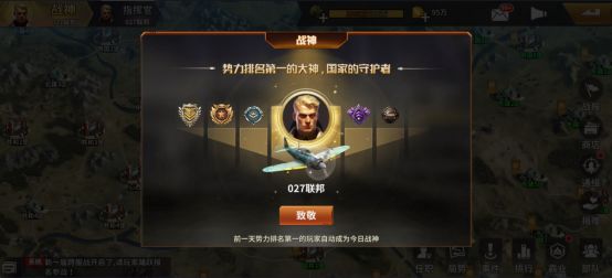 1.战神,前一天势力排名第一的玩家自动成为战神,可以“致敬”战神,获得复活卡,复活卡可复活阵亡的部队。