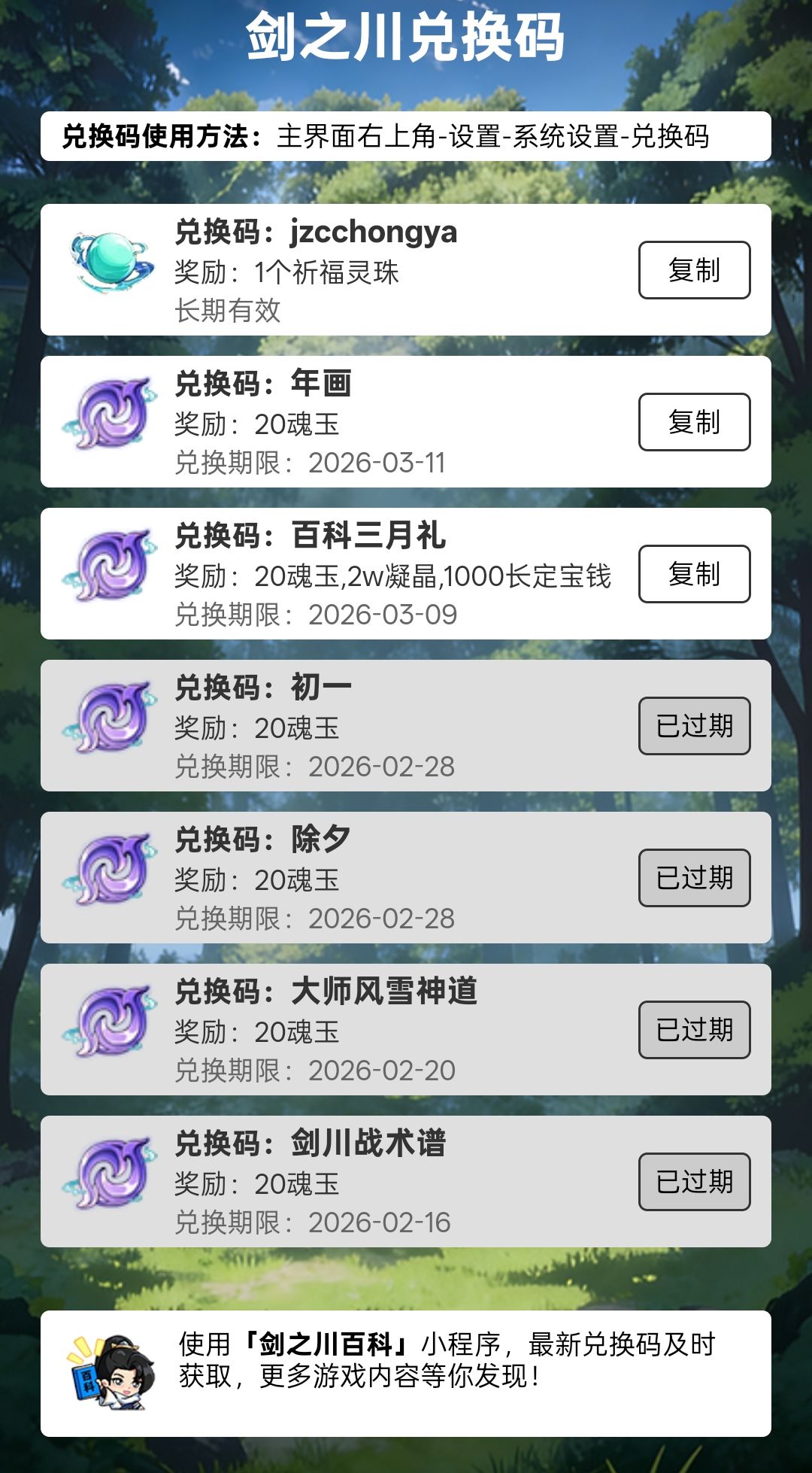 兑换码就放在「剑之川百科」小程序里了