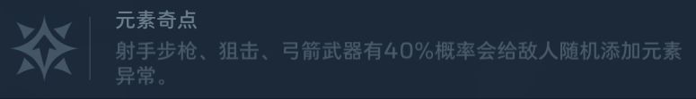 ①元素奇点:射手步枪、狙击、弓箭武器有40%概率会给敌人随机添加元素异常。