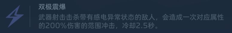 ③双极震爆:武器射击击杀带有感电异常状态的敌人,会造成依次对应属性的200%伤害的范围冲击,冷却2.5秒。