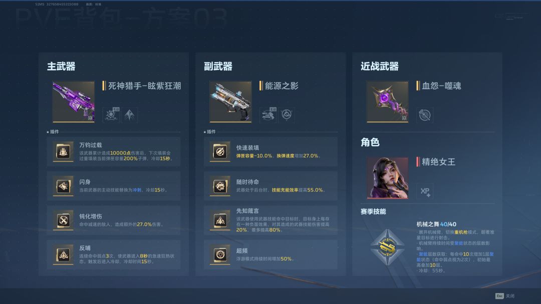 对BOSS输出推荐“钝化流”死神猎手,并搭配副武器能源之影。借助“元素奇点”效果,死神猎手的攻击有概率为目标附加寒冷效果,从而触发“钝化增伤”插件获得固定的27%伤害加成。同时,攻击也有概率附加电弧效果,进而享受“感电连锁”的10%伤害加成。近战武器可选择血怨或震沙锏。