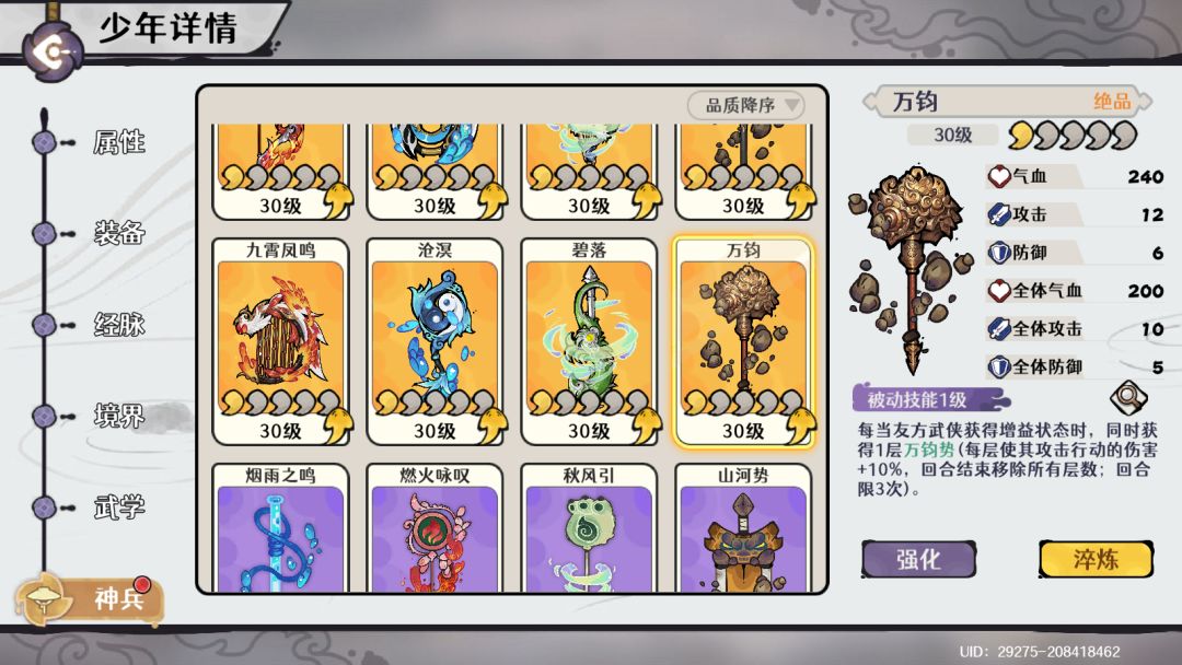 全新绝品神兵「万钧」现世,限时 UP 卡池火热开启!此宝兵擅增幅攻击伤害,叠加buff,锐不可当!有归鸿仙君同行护道,再携神兵助阵,少年新岁驰骋江湖,一路披荆斩棘,所向披靡!