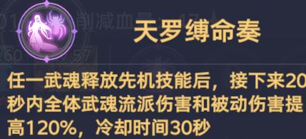 天罗缚命奏:任一武魂释放先机技能后,接下来20秒内全体武魂流派伤害和被动伤害提高120%,冷却30秒,最大化千仞雪叠层后的爆发伤害。