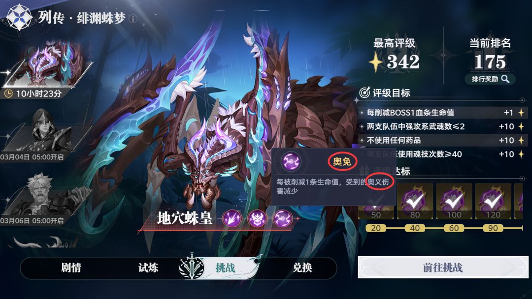 1. 生存压力大:地穴蛛皇的攻击伤害很高,战斗中要利用闪避躲避关键技能,避免被秒杀。每场战斗仅可复活1次,需谨慎操作。