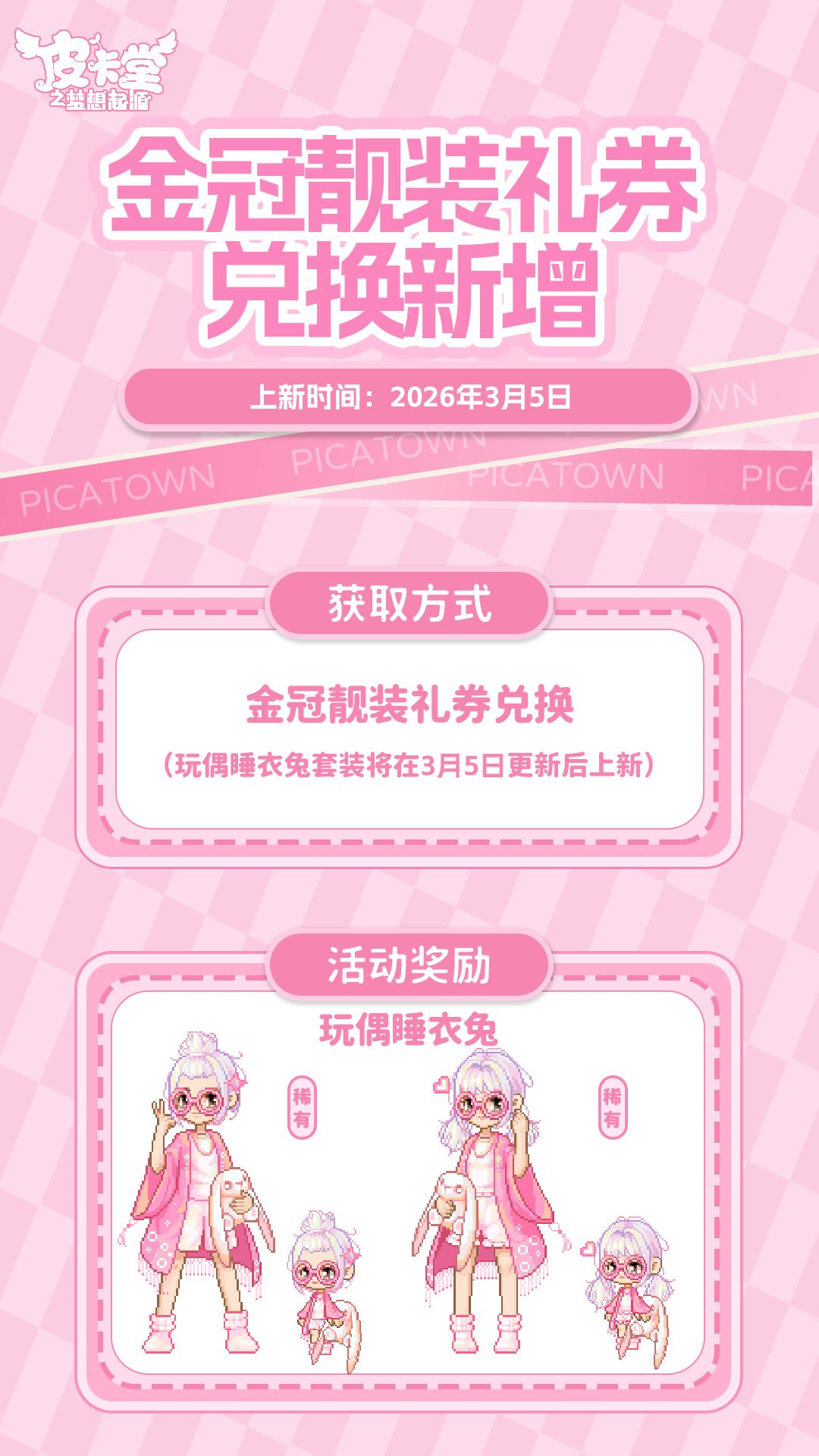 -【金冠兑换】稀有套装「玩偶睡衣兔」将上架金冠商城,购买金冠可获得兑换道具靓装兑换券!