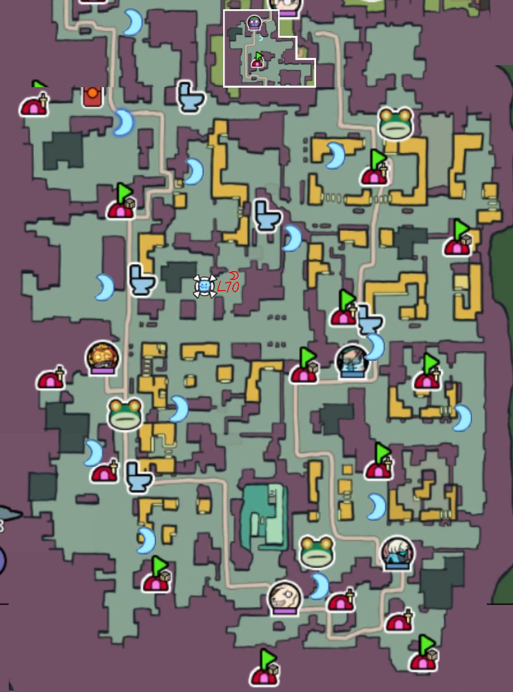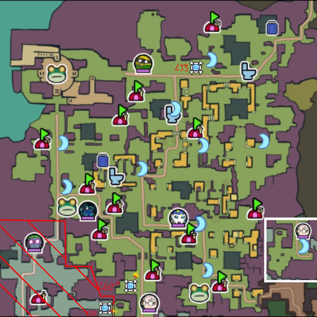 以上地图也标注了16个再生BOSS的位置和等级,黄色方块与箭头是逃课打法的位置,对部分BOSS有奇效。绿帽营地中间的70级BOSS和贸易区的BOSS与别的刷新时间不一样,建议黑夜(现实时间)去打。