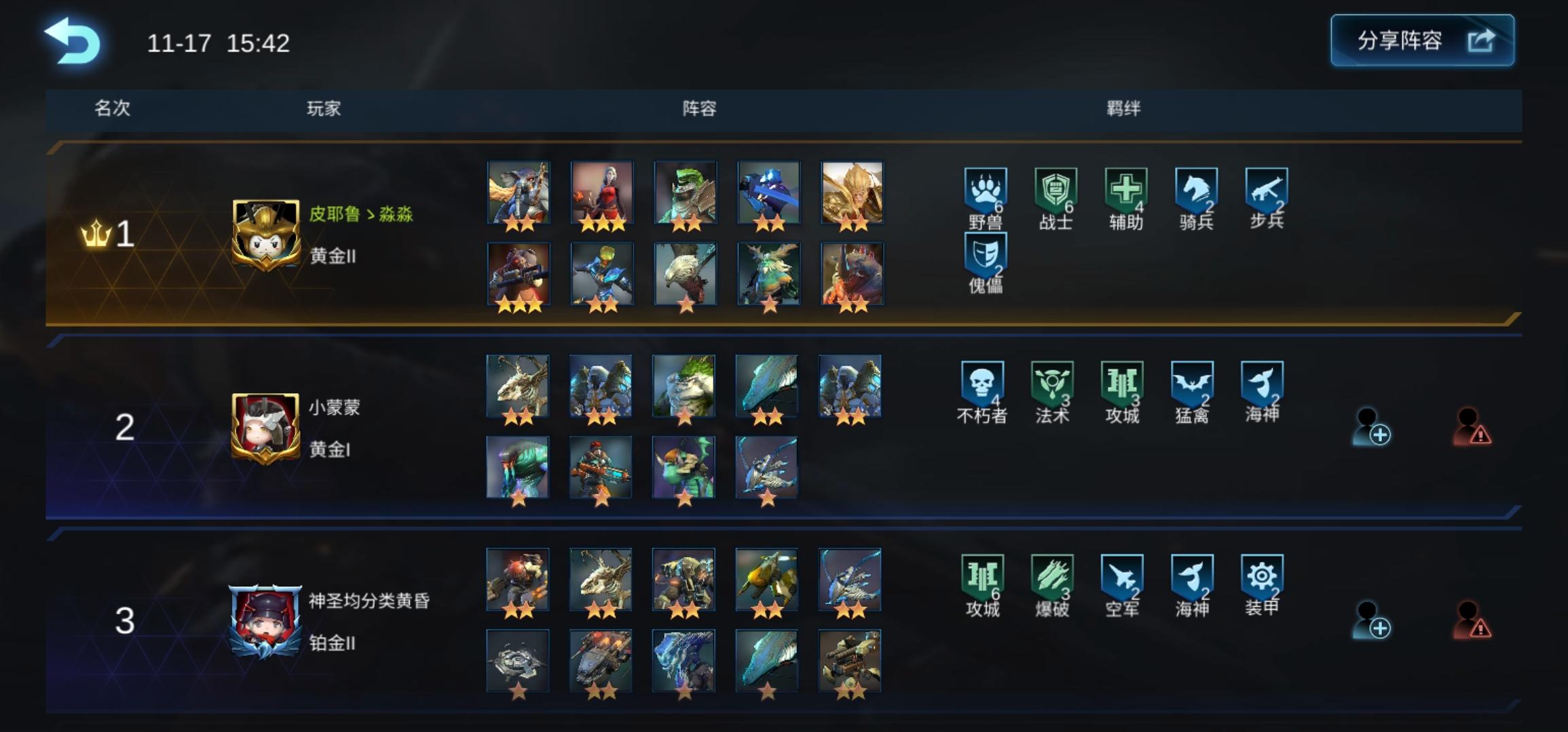 猴子 大象 鹰 鹿 犀牛 蜥蜴 刀奴 剑奴(棍奴) 喷火 医疗,这套就6战6野兽2辅助2步兵2傀儡了。有攻速,有防御有魔抗。然后如果敌人法术多就拿紫装变2辅助,如果物理多就变2战士。后期有钱了可以拿蓝装变骑士给输出。砍人嗖嗖的。