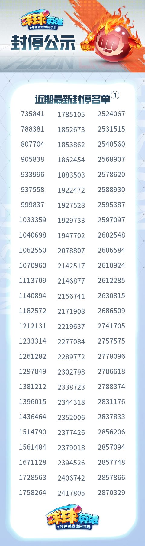 所以请各位球宝千万不要心存侥幸,一定要和我们一起,坚决抵制使用任何破坏游戏平衡软件的行为!对于使用外挂行为的玩家我们将持续进行公示,下面公示近期最新封停名单:(以下名单为角色ID)