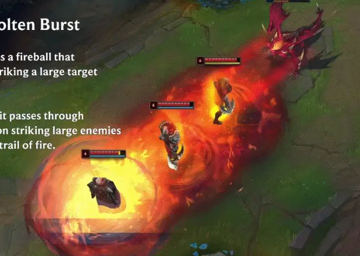 E技能熔岩爆裂:发射火球,命中大型目标后爆炸并造成减速;龙形态下火球可穿透敌人,命中后留下火焰轨迹持续输出。