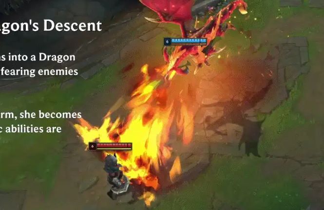 R技能魔龙降世:化身魔龙向前飞跃,恐惧沿途所有敌人;龙形态下体型增大,基础技能全面强化。