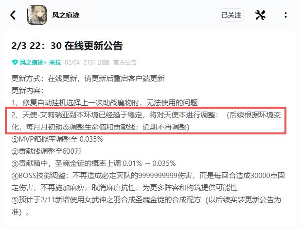 根据天使-艾莉瑞亚副本环境动态调整(月度):