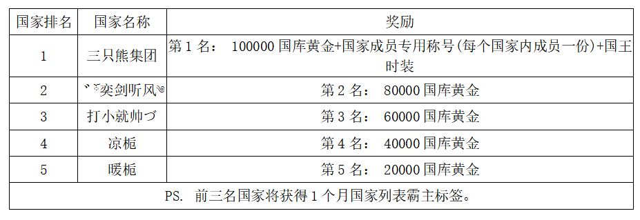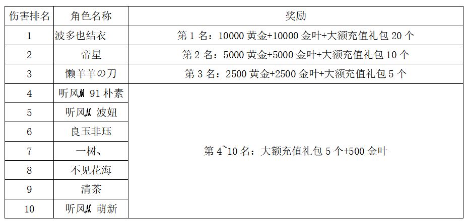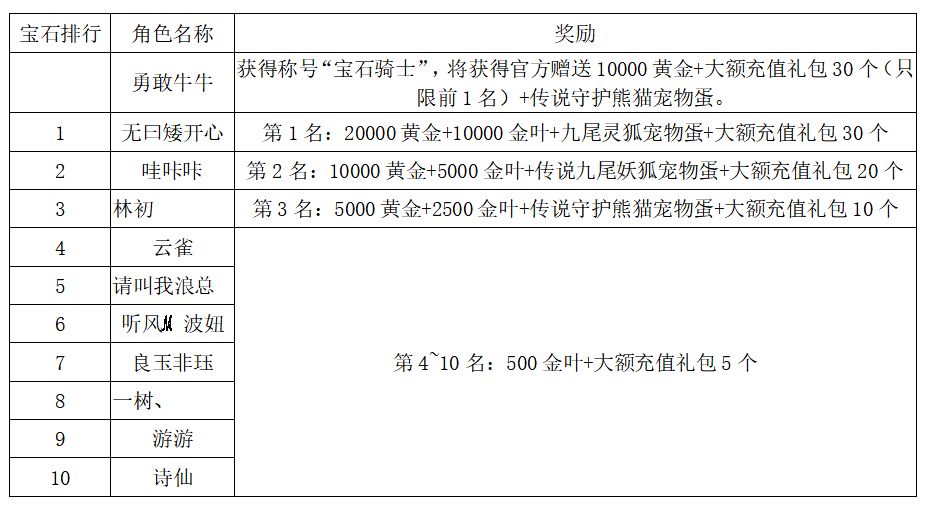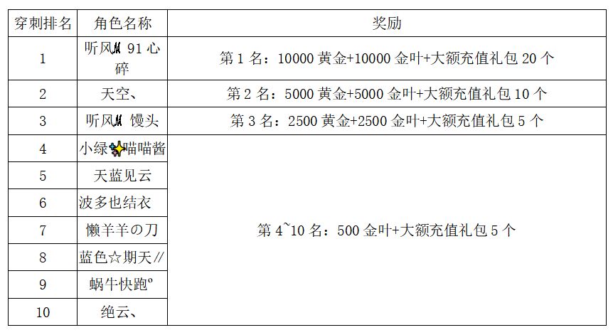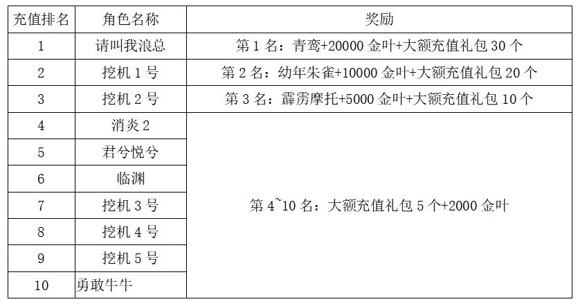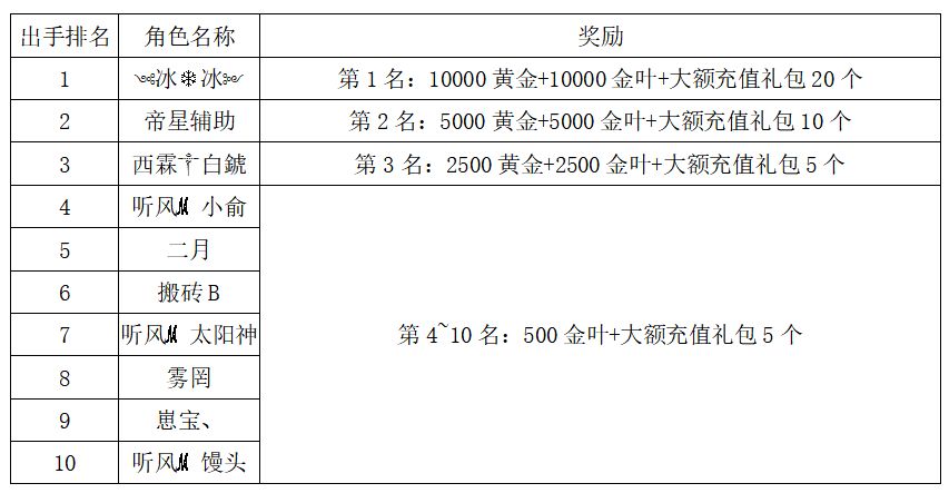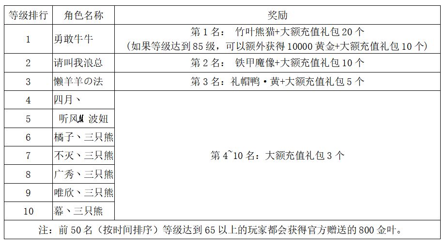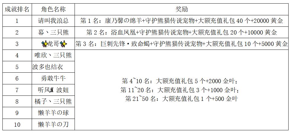 注:以上活动排名均以服务器时间为准。新区排行榜活动如发现存在违反游戏相关规定使用游戏外的辅助工具进行作弊将取消获奖资格。