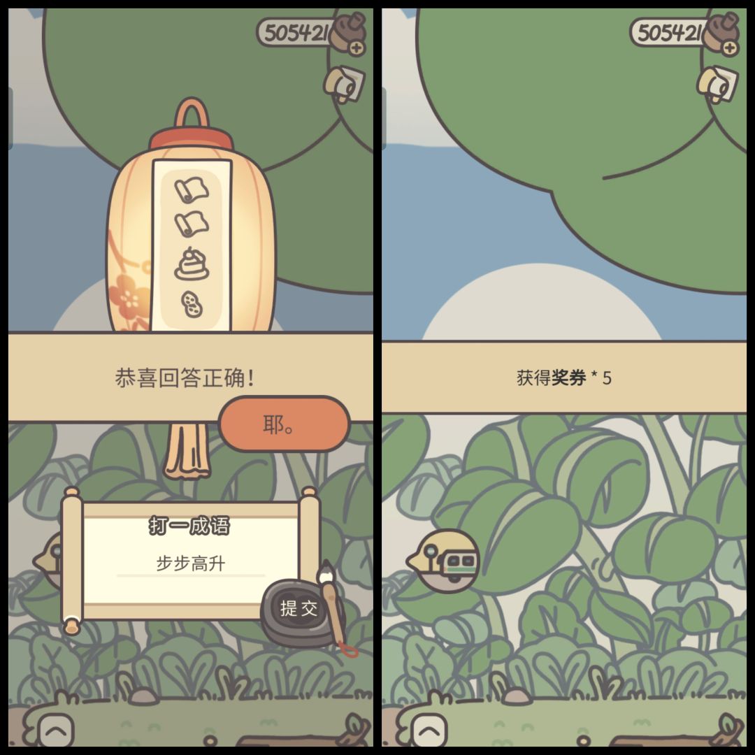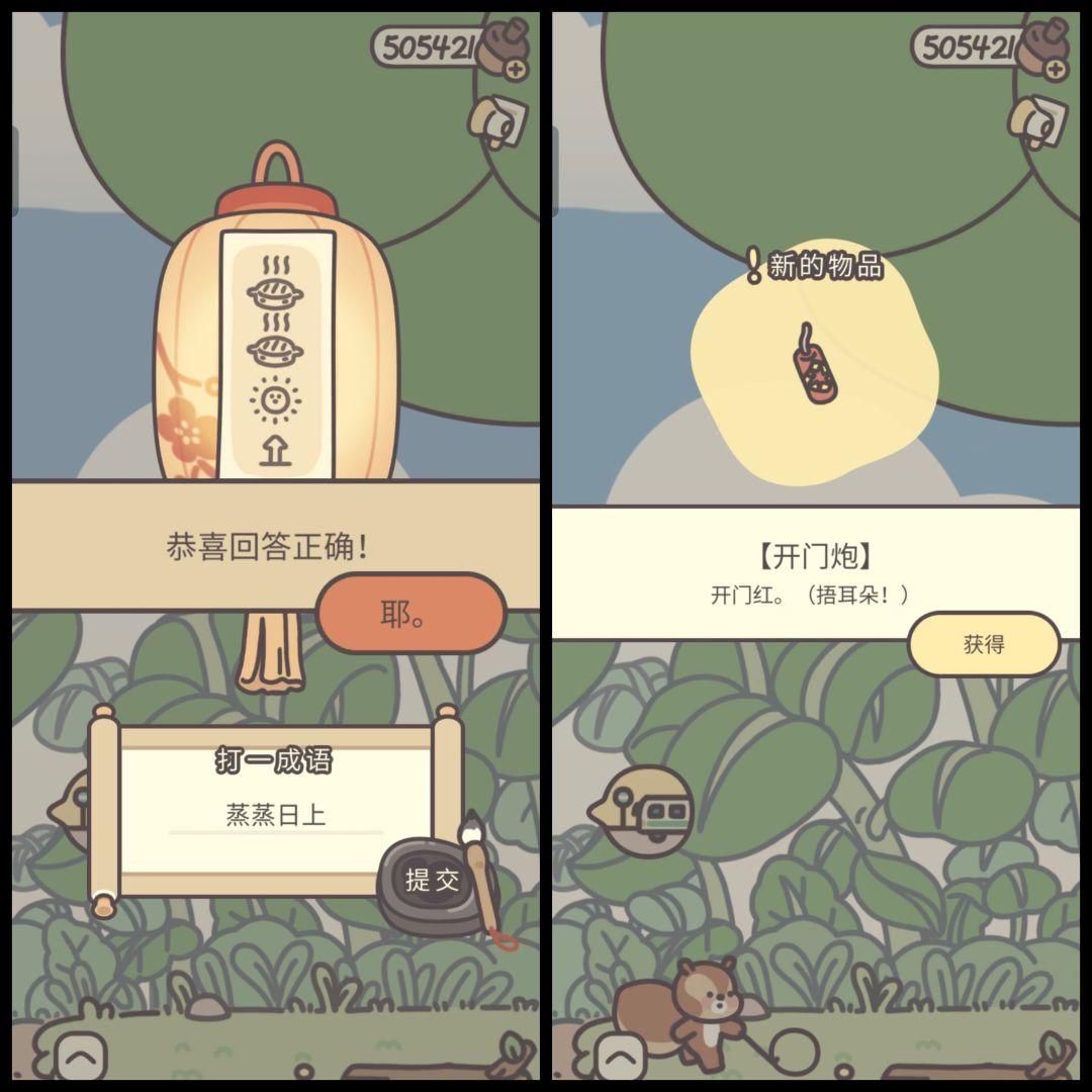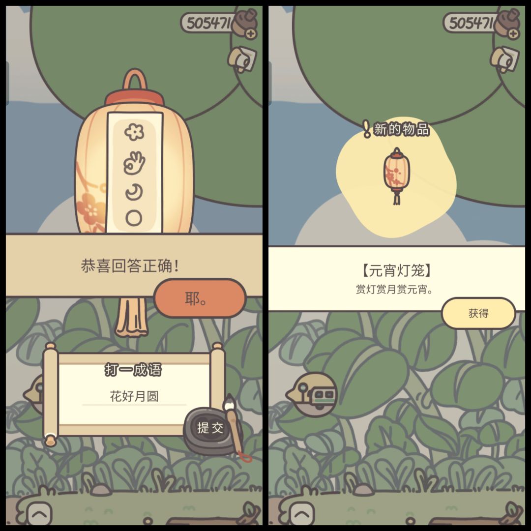 “花好月圆”灯笼(图五)会获得日记《打灯谜》和一个“元宵灯笼”可以挂在橡子屋门口,其他的灯谜灯笼都只能开出烟花或者零食,我自己留了两个灯笼没开做纪念