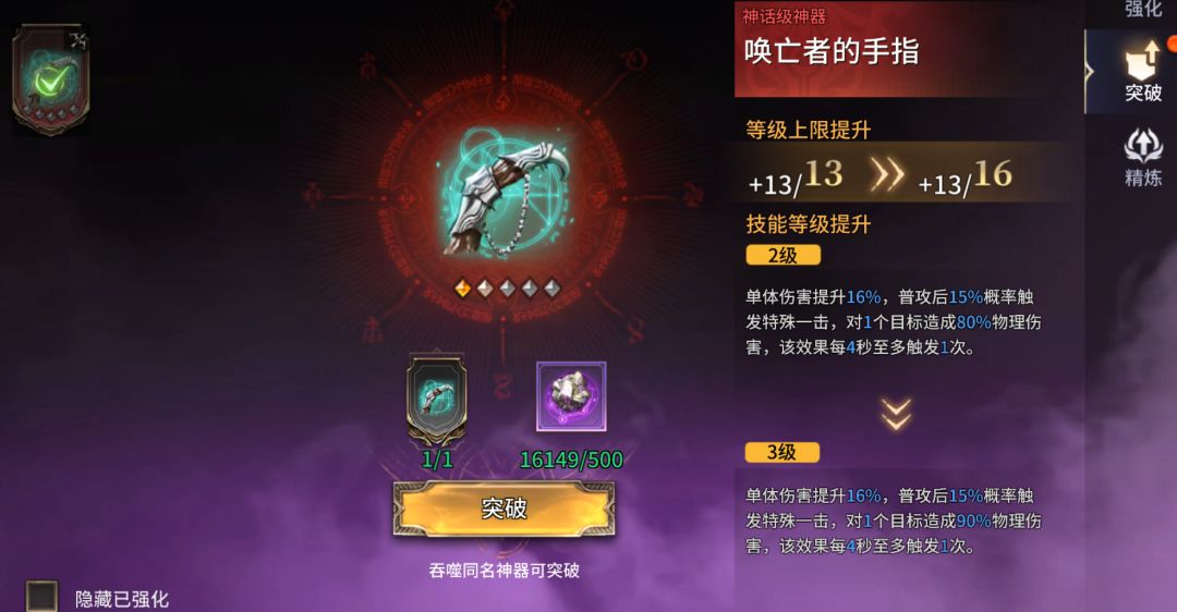 神器相当于是特殊装备,可给英雄提供基础属性及赋予额外的神器技能。我们可以通过秘银强化装备,装备从10级开始,每3级要进行突破才能继续强化。