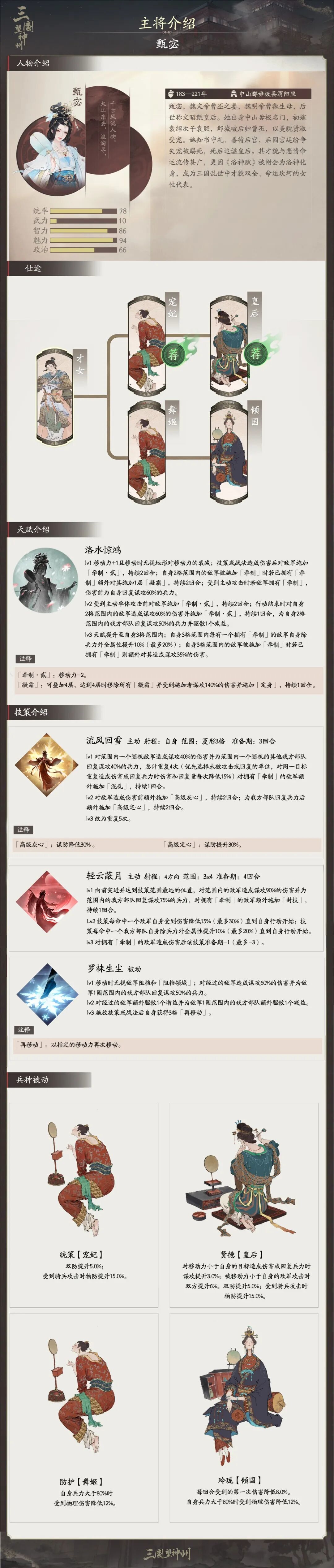 甄宓是强力的策士/后勤系主将,拥有【皇后】、【倾国】两种进位选项。身为洛水神女、文昭皇后,她兼具倾城容貌与绝世智计,甄宓的天赋【洛水惊鸿】能无视地形对移动力衰减,同时对敌军稳定施加牵制、凝霜、定身等减益,完美诠释其蕙质兰心、巧驭战局的绝代风华。