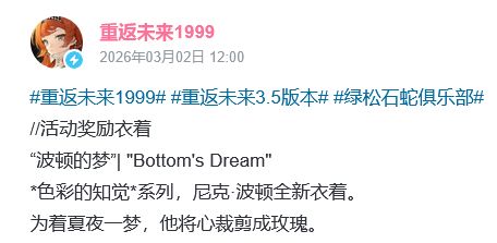 原因和你游最近爆料的皮肤内容有关,3月5号不是要来的3.5版本绿松石蛇俱乐部嘛。官方爆料了四款全新皮肤详情,爆料的皮肤分别是尼克波顿的新皮肤波顿的梦、告死鸟的将哀啼也燃尽、库珀花环的玻璃乌托邦、蓝手帕的冷襁褓,只有尼克波顿的新皮肤是送的