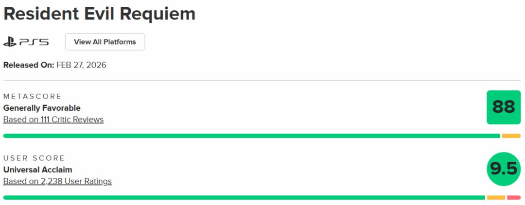 近日,《生化危机9:安魂曲》再创佳绩,以9.5分的高分斩获M站(Metacritic)用户评分历史榜首,正式成为该平台玩家评价最高的游戏,口碑迎来爆发式增长。