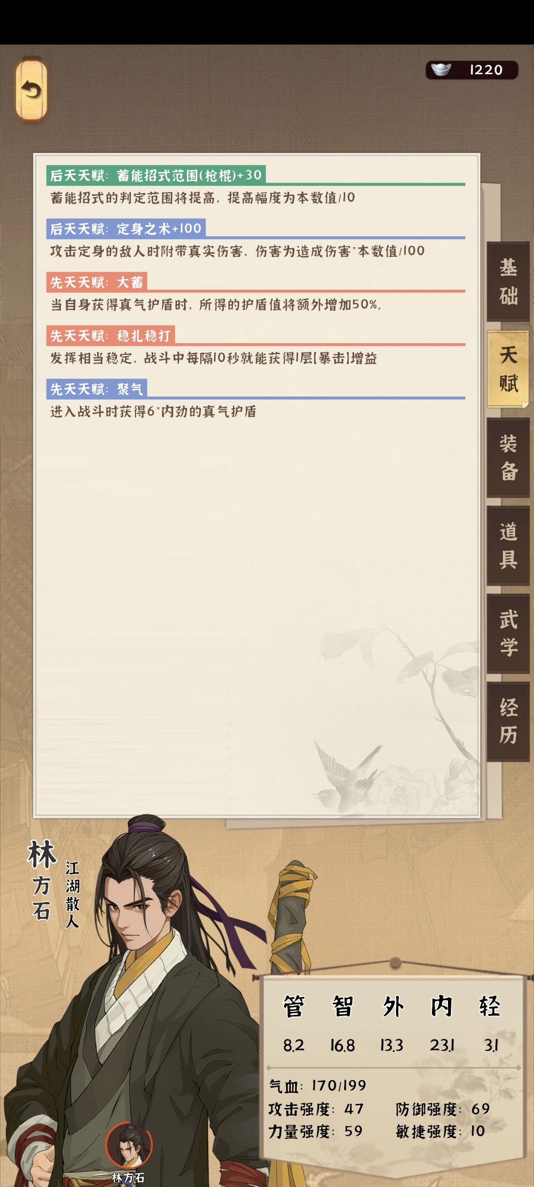 大蓄+聚气,另一个任选我这里选择的是暴击,开局随点内功高就行