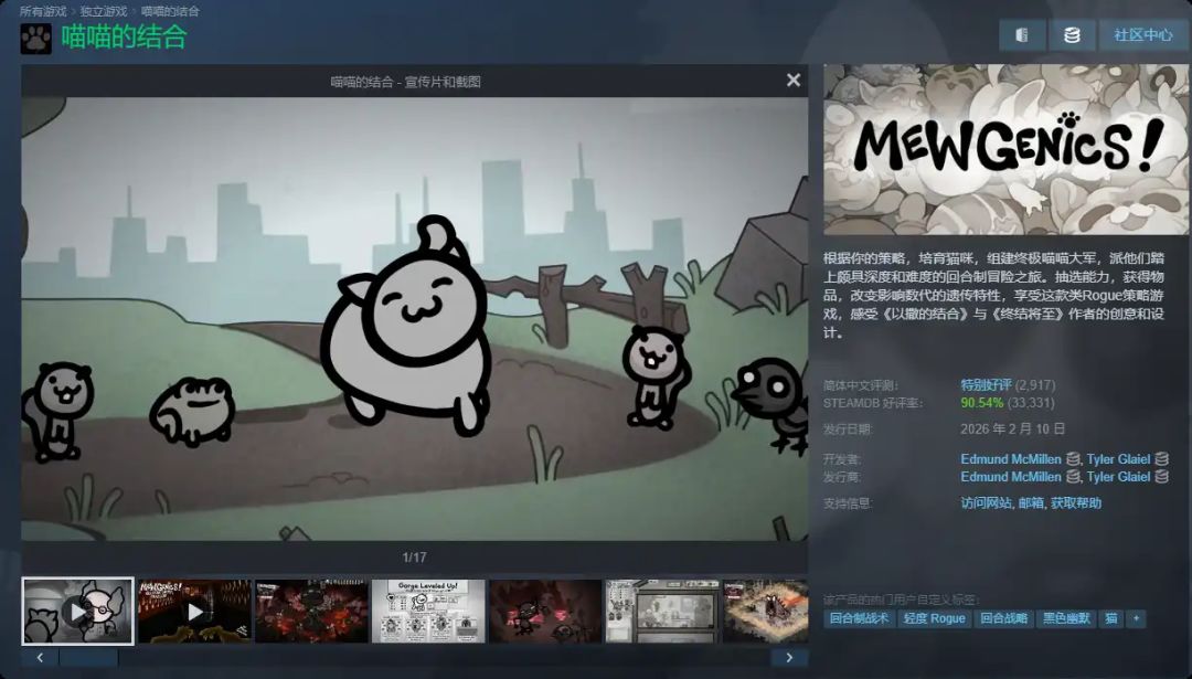 《喵喵的结合》是由开发过《以撒的结合》的Edmund McMillen和Tyler Glaiel联手打造的,这款游戏属于系统丰富耐玩度非常高的肉鸽战棋游戏。游戏分为两个部分,一部分经营猫舍,让猫猫进行爱爱及精选猫咪不断壮大族群。