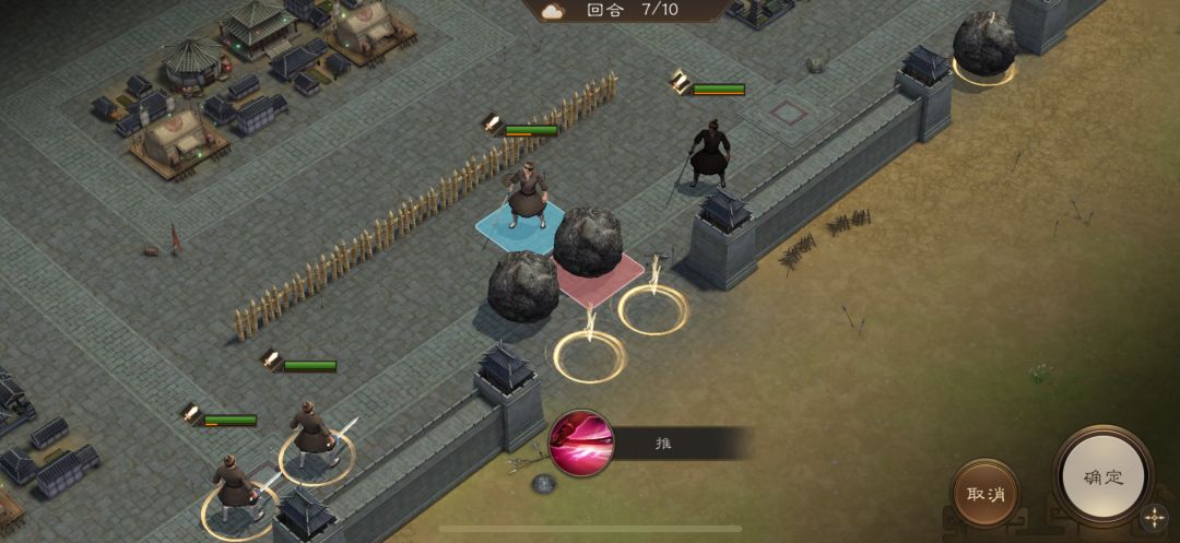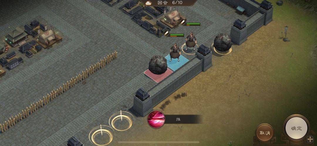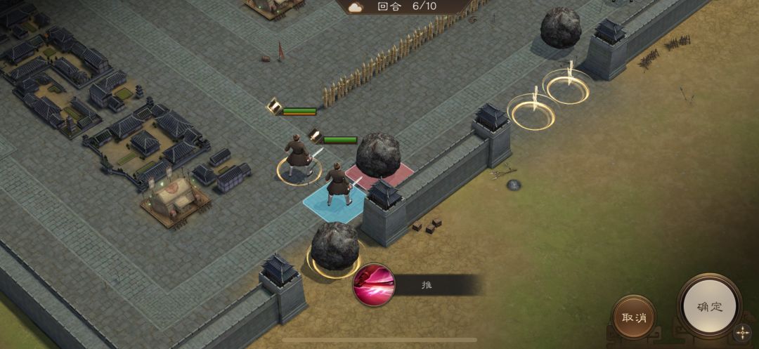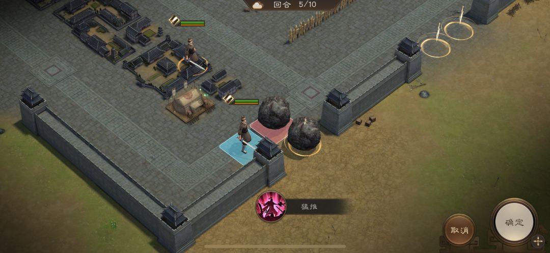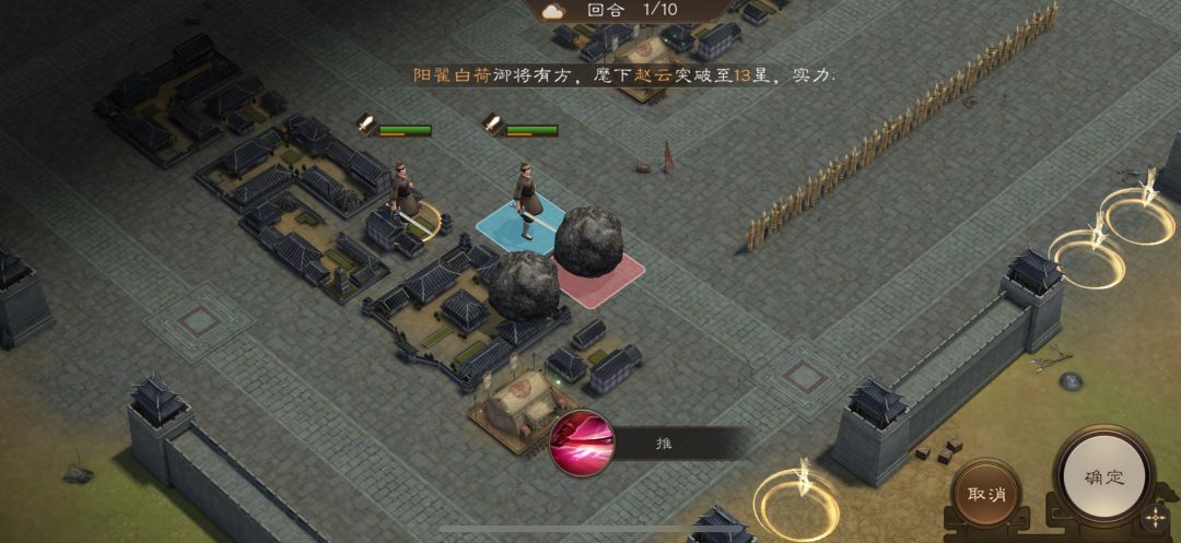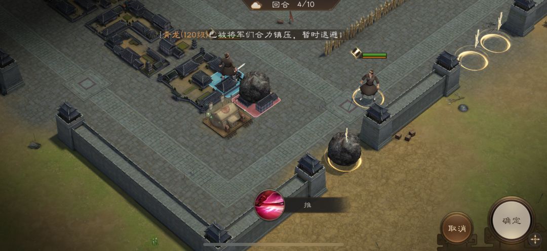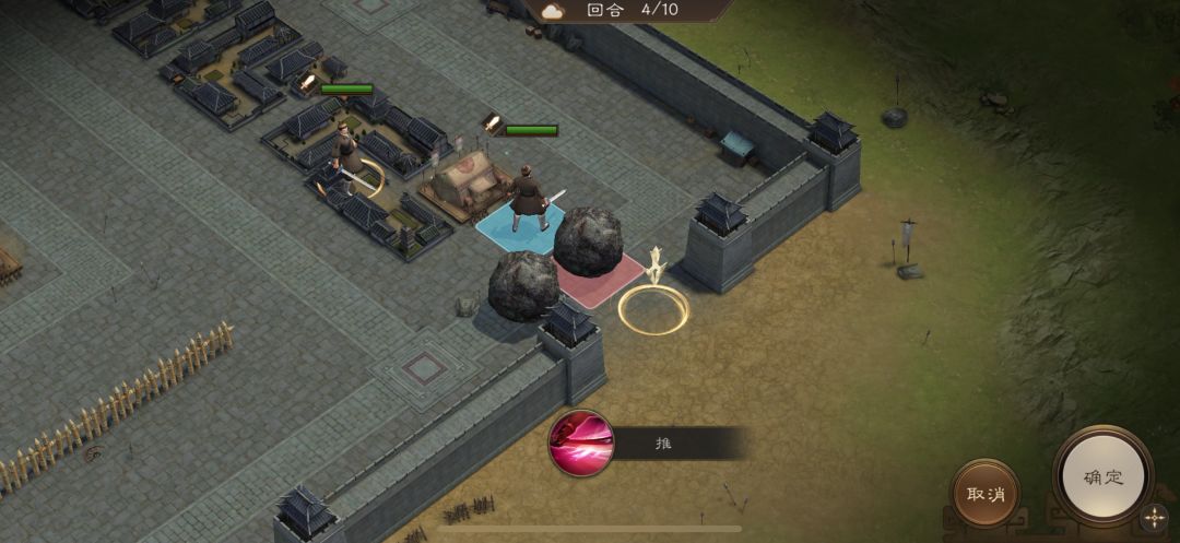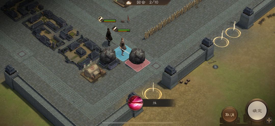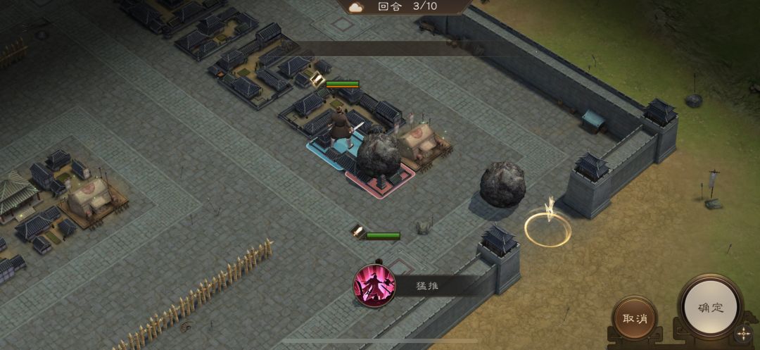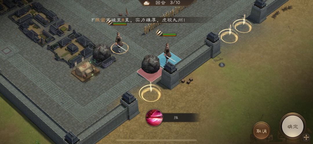 游历事件修缮城墙,是非出站式剧情,核心是操控4名百姓推石料到城墙缺口,机制和推石头一致。出战无需武将,第一回合让百姓各自贴近对应石料,用小技能将石料推1格归位;第二回合对远处石料平推即可到位。全程重点算好行动距离,别浪费回合数,十回合完全足够,石料全部推到缺口就能完成修缮通关。