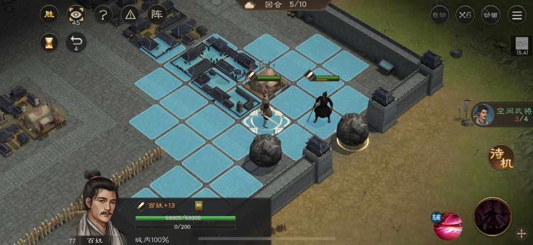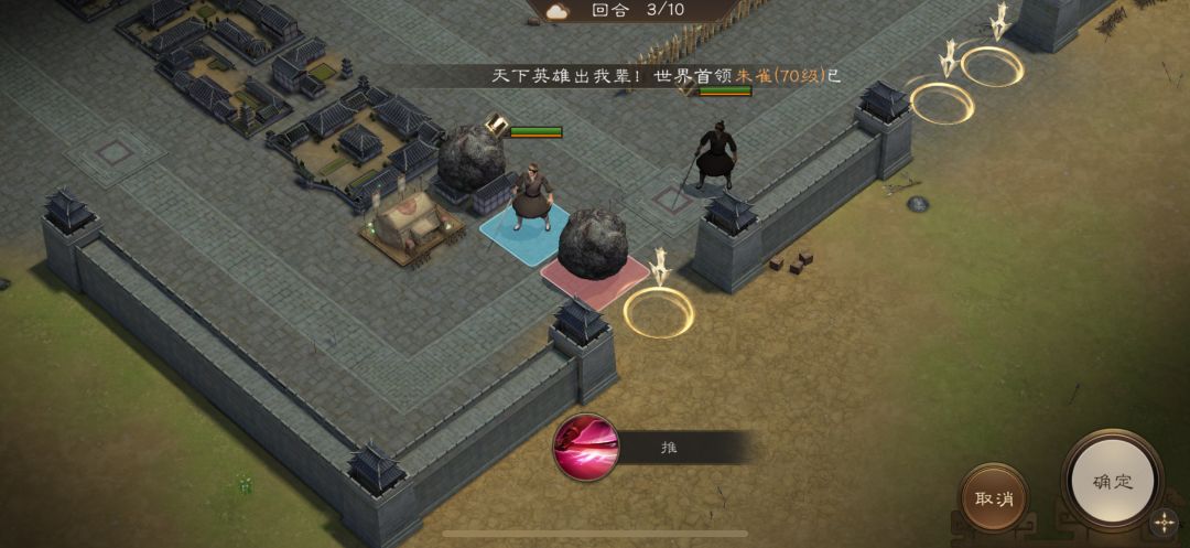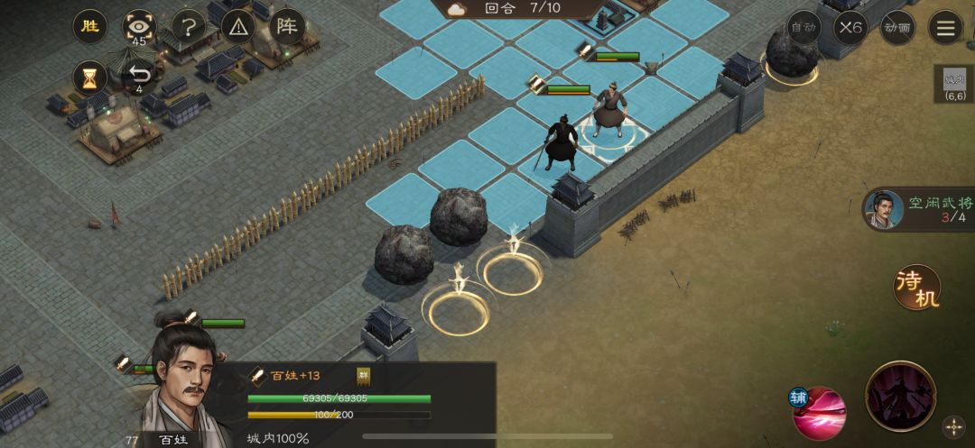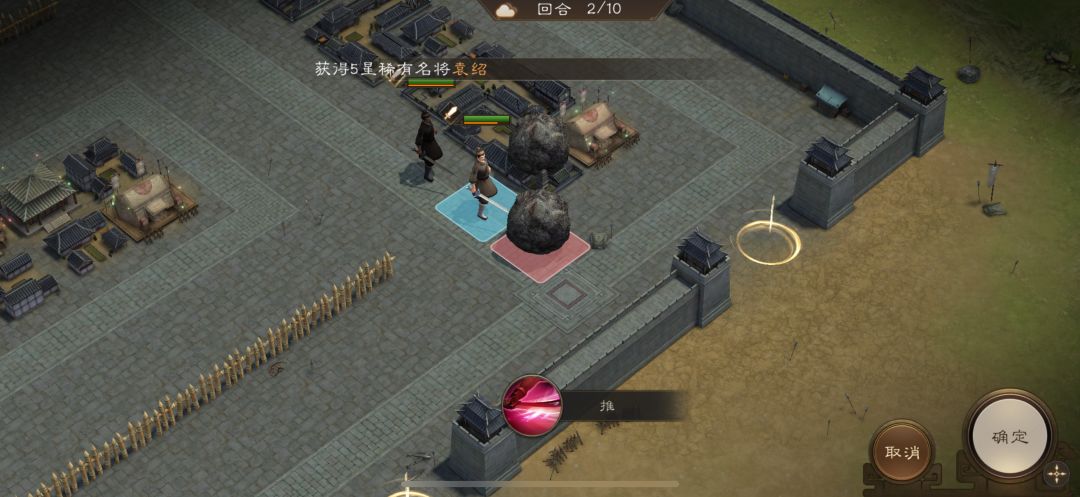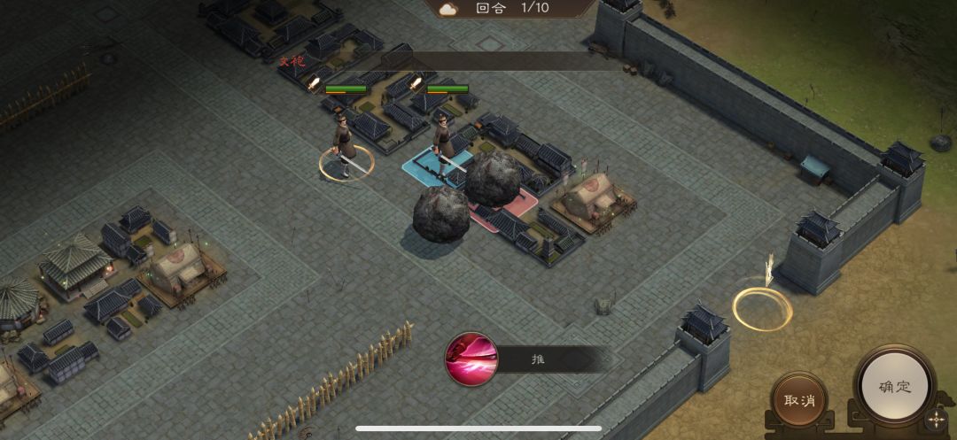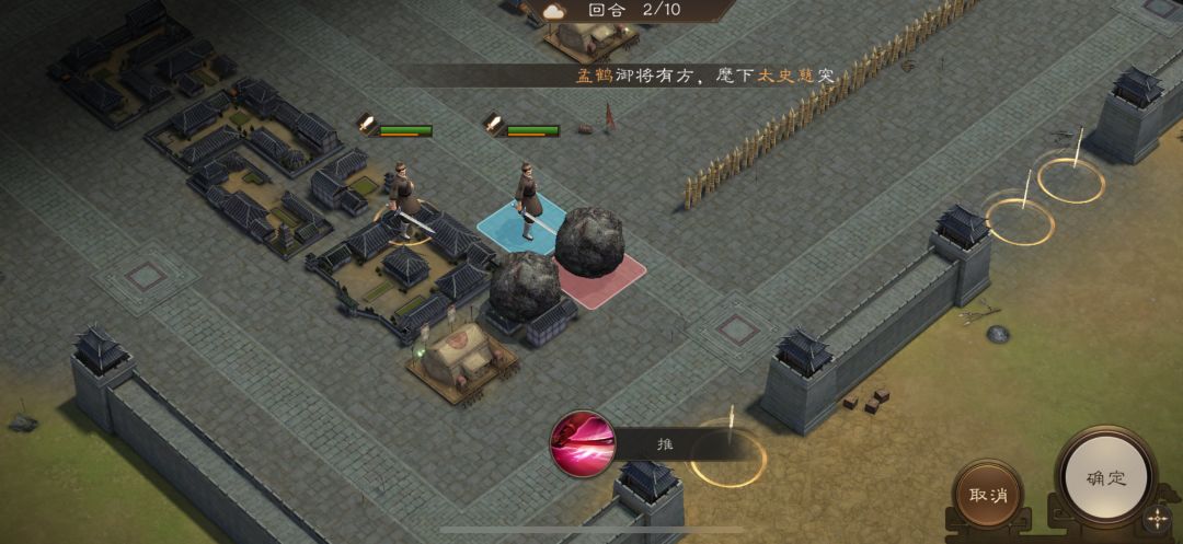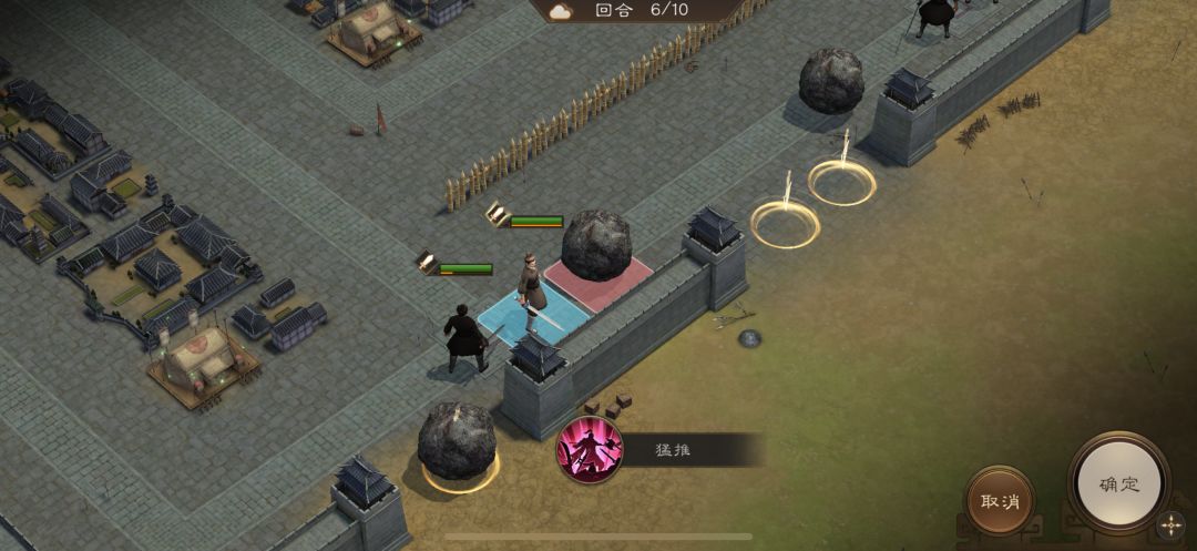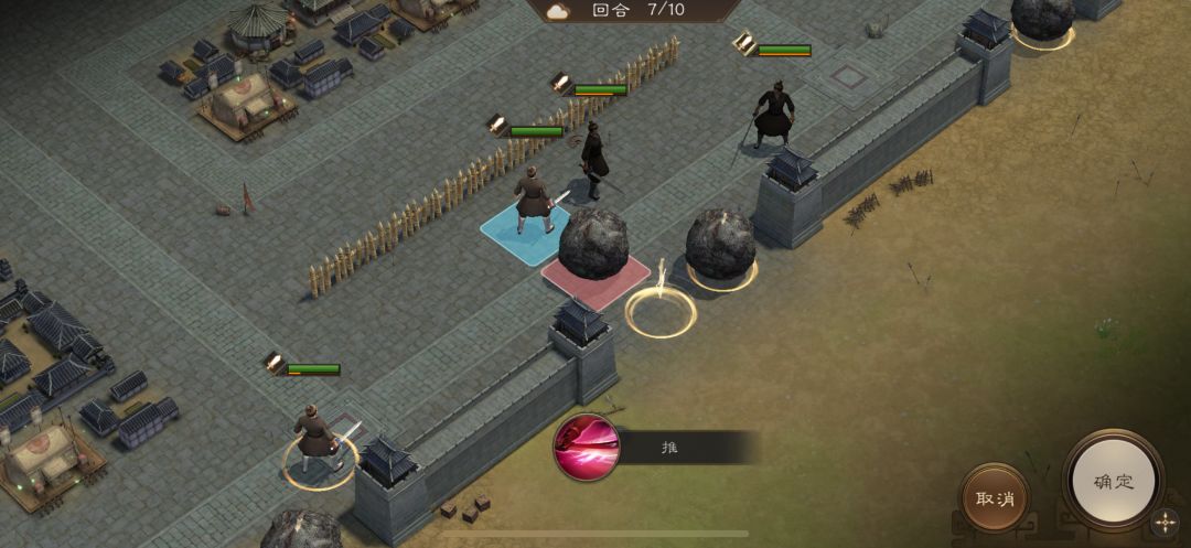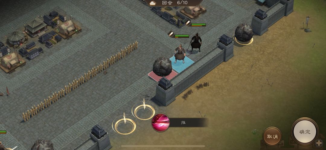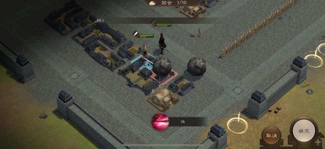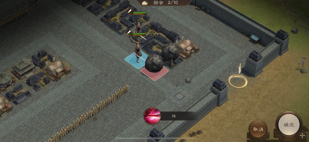 游历事件修缮城墙,是非出站式剧情,核心是操控4名百姓推石料到城墙缺口,机制和推石头一致。出战无需武将,第一回合让百姓各自贴近对应石料,用小技能将石料推1格归位;第二回合对远处石料平推即可到位。全程重点算好行动距离,别浪费回合数,十回合完全足够,石料全部推到缺口就能完成修缮通关。