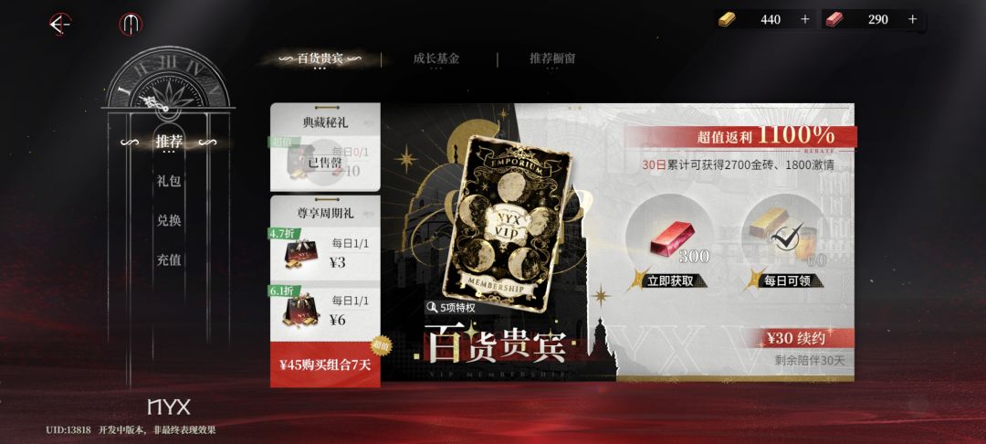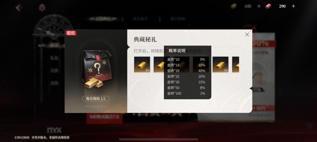 购买月卡后解锁典藏秘礼,可每天花费10红转获得不定数量的金砖,最少10金砖最多100金砖。