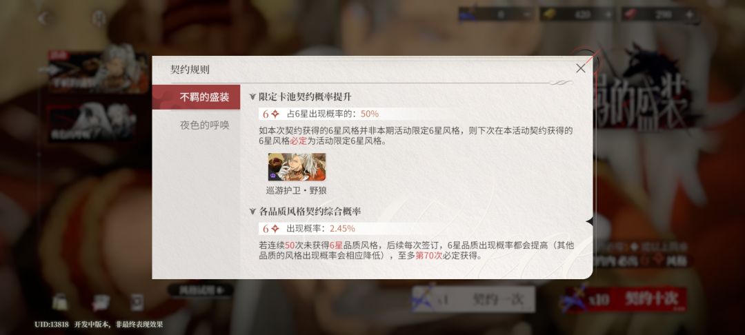 限定卡池是野狼的六星卡,限定卡占六星出现率的50%,70抽小保底可能歪常驻卡,140大保底必出限定卡。限定卡池使用秘誓之刃抽卡。所以限定卡池和常驻/新手卡池的抽卡道具并不互通。都是180金砖一抽。