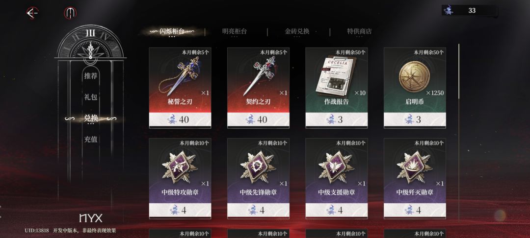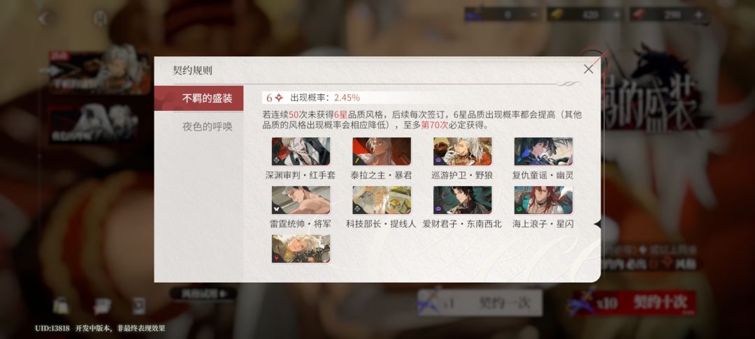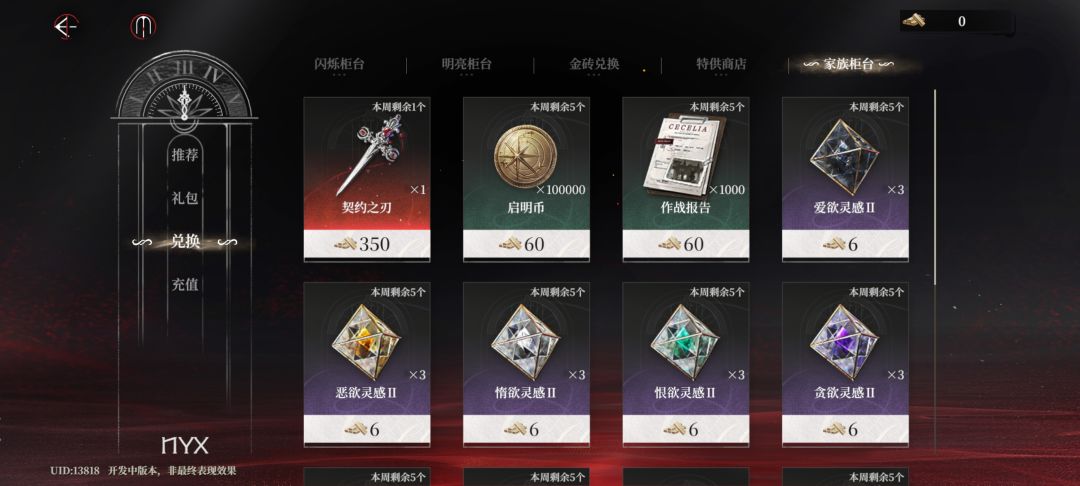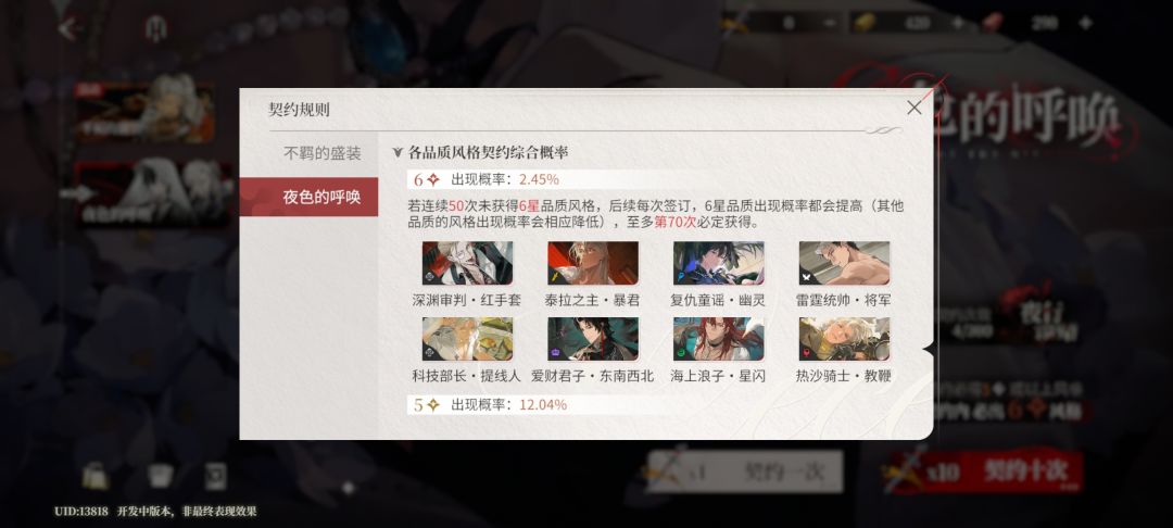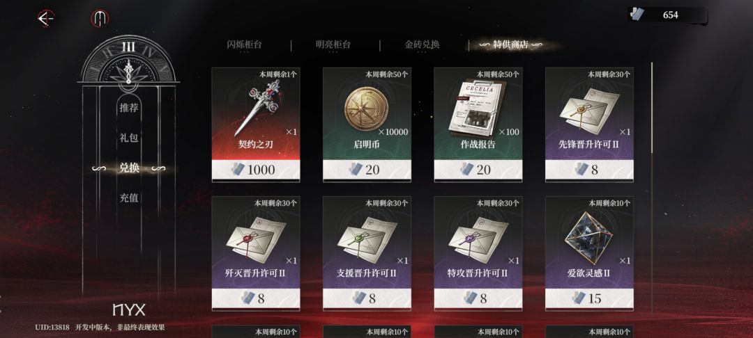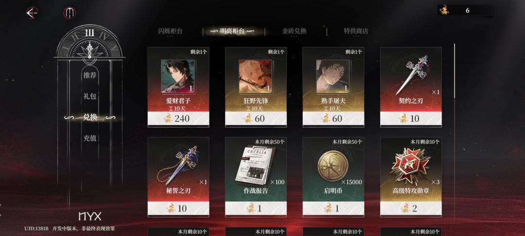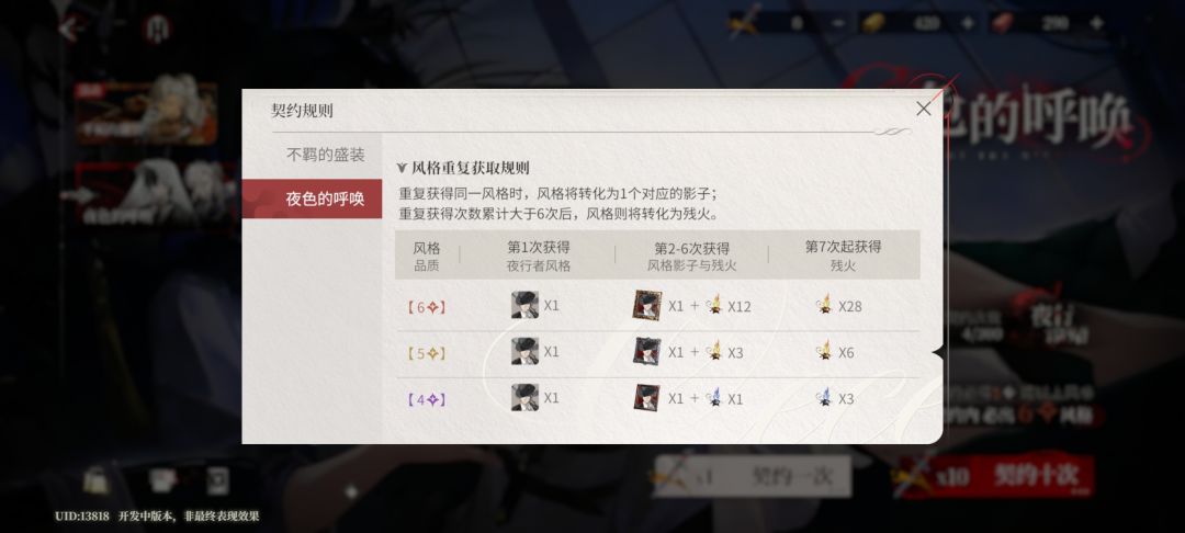 10个金火就可以兑换1抽限定/1抽常驻,重点金火可以兑换六星卡和五星卡,本次可兑换的卡如图。暂时不清楚可兑换的卡是只有这三张卡还是所有卡进行轮换兑换的,如果是轮换的但因为本次测试只有10天也暂不清楚多久一轮换之类的规则。