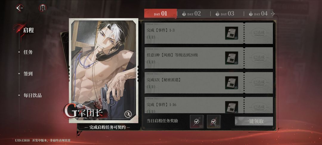 启程任务完成第一天任务获得10抽常驻,总共七天任务,完成后续任务可获得将军五星卡。依稀记得后面几天应该是还送抽数的,后续开了再更。第二天2抽常驻+360金砖。