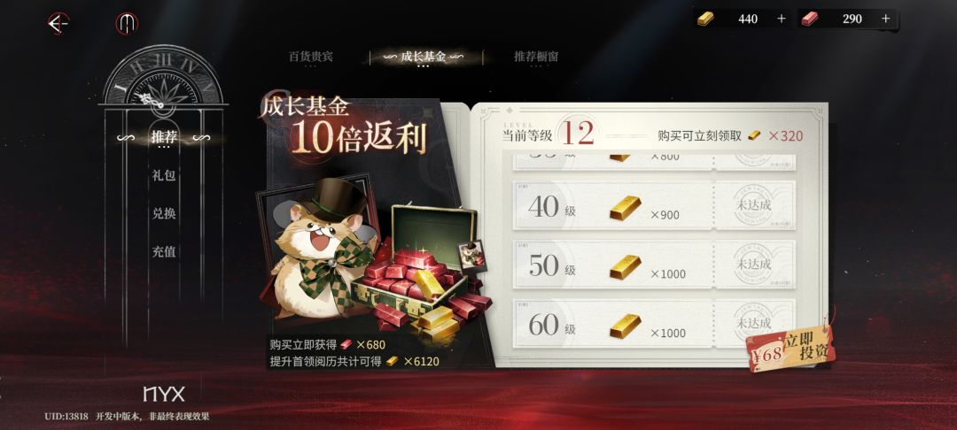 成长基金68r,购买就返还680红砖,最多升到60级给6120金砖。