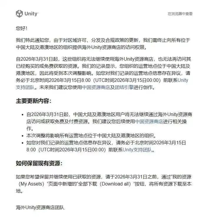 海外Unity资源商店发布邮件通知:由于区域许可、分发及合规政策的更新,自2026年3月31日起,海外 Unity 资源商店将终止向所有位于中国大陆及港澳地区的组织提供访问权限。