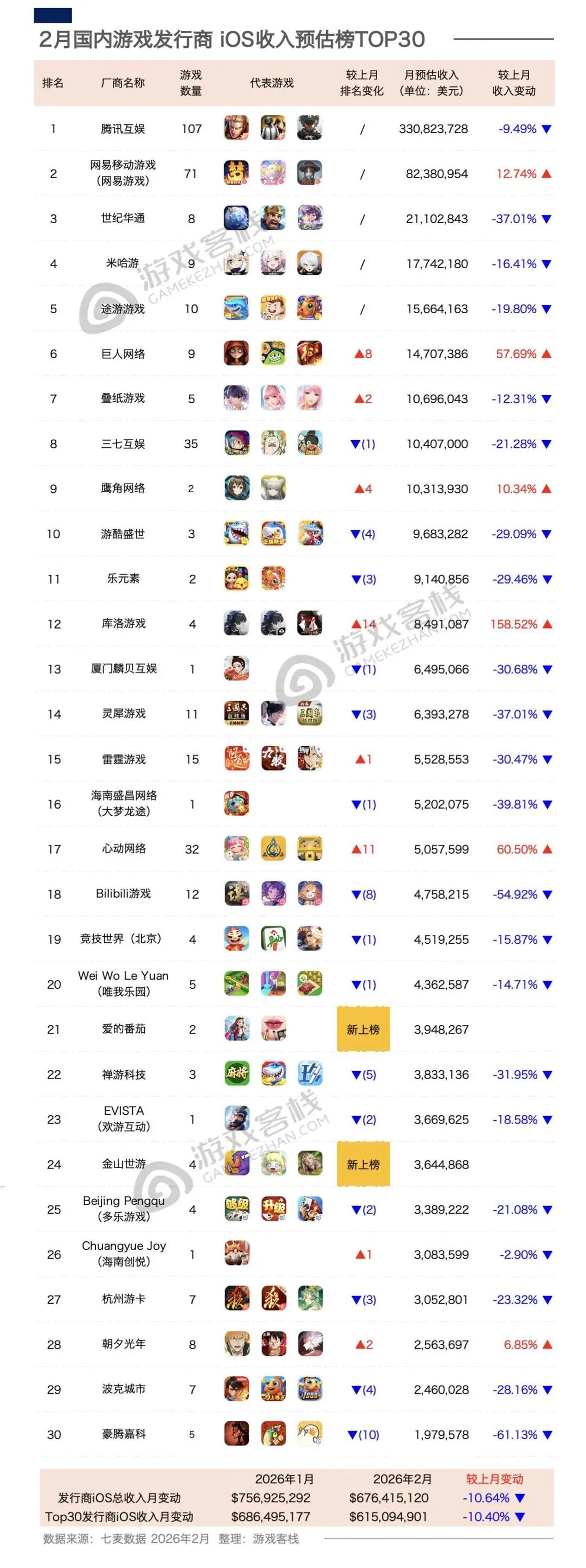 我们根据七麦数据发布的数据,整理出“2026年2月国内游戏发行商iOS收入预估榜TOP30”。2月国内游戏发行商iOS总收入6.76亿美元,环比下降10.64%,其中TOP30总收入6.15亿美元,环比下降10.4%。