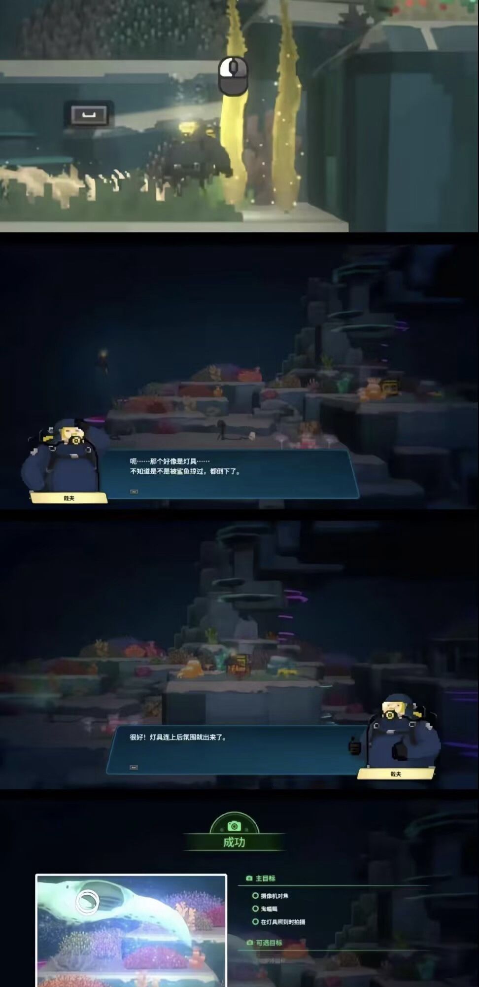 获取完毕后自动触发后续任务,寻找设置好灯具的位置,需要夜潜。