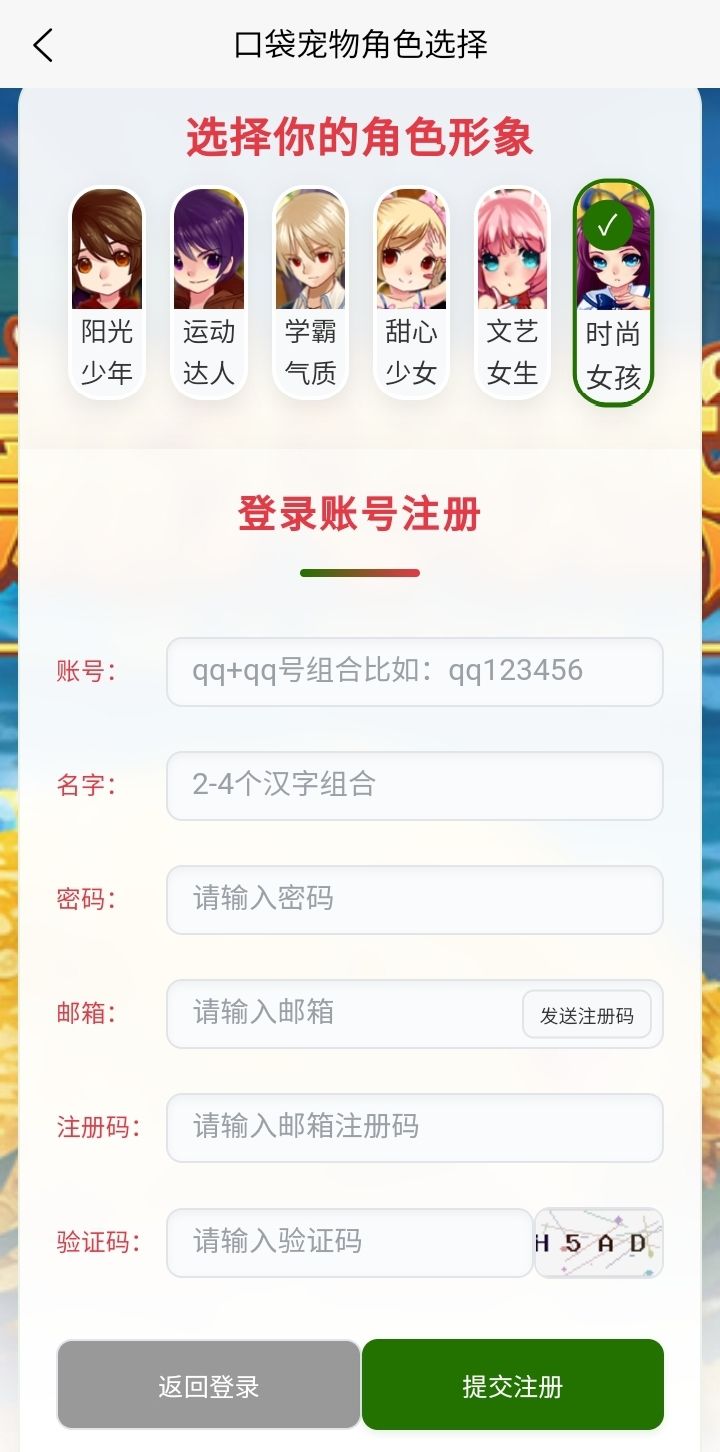 在《口袋宠物》的世界里,你可以自由选择阳光少年、运动达人、学霸气质、甜心少女、文艺女生或时尚女孩等专属角色形象,用个性造型开启萌宠相伴的冒险。注册时只需设置专属账号、昵称与密码,绑定邮箱获取注册码,即可快速加入游戏,与可爱宠物并肩作战,探索充满惊喜的口袋世界。