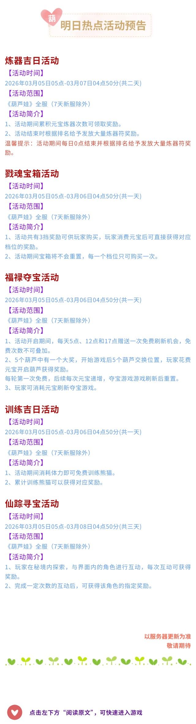 【葫芦娃】3月5日活动预告